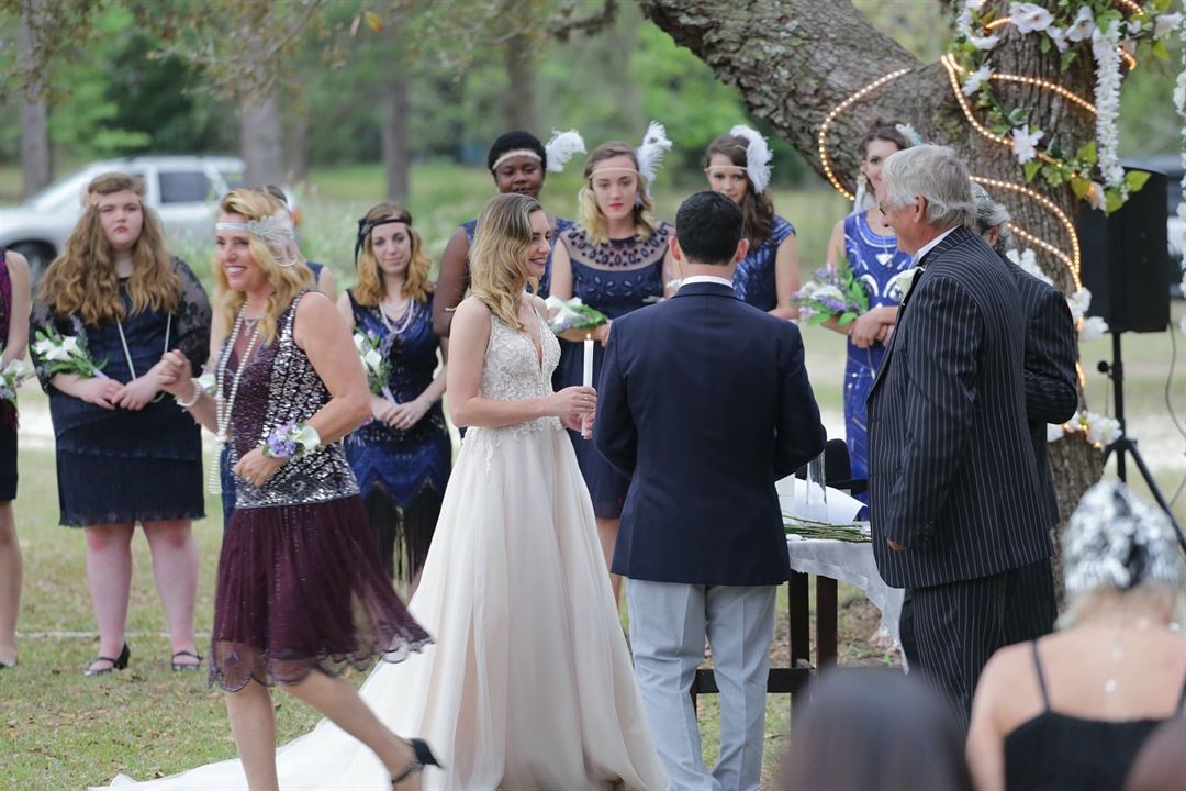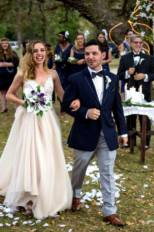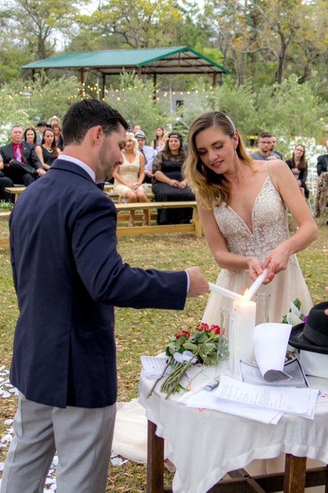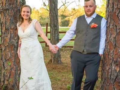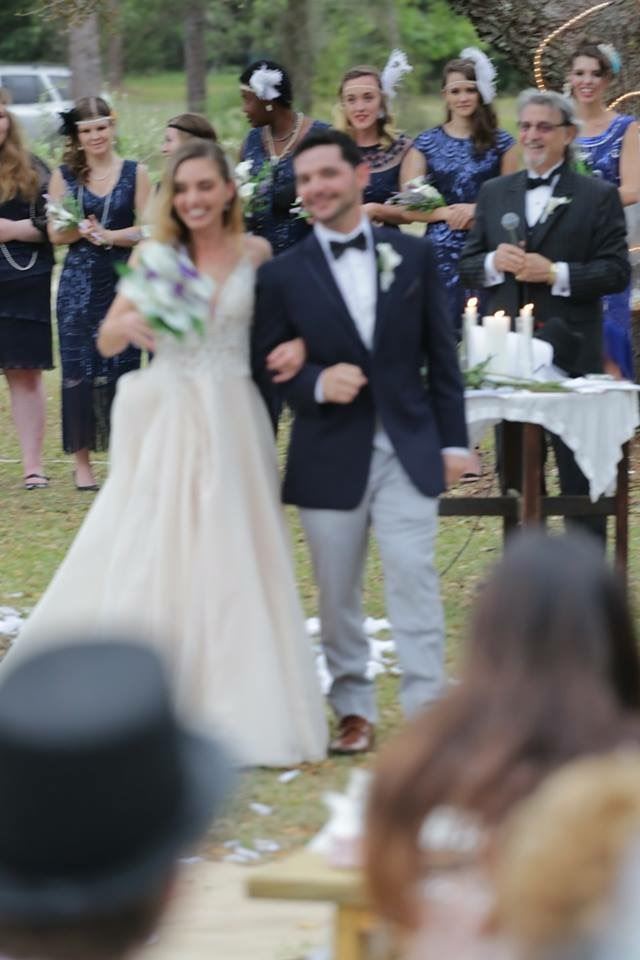 Guests arrive and gather near the gazebo for the cocktail hour. Guests are seated under the beautiful grandfather oaks for the ceremony. The bride and groom walk through the orchard to the oaks where they stand before their friends and family and exchange oaths.