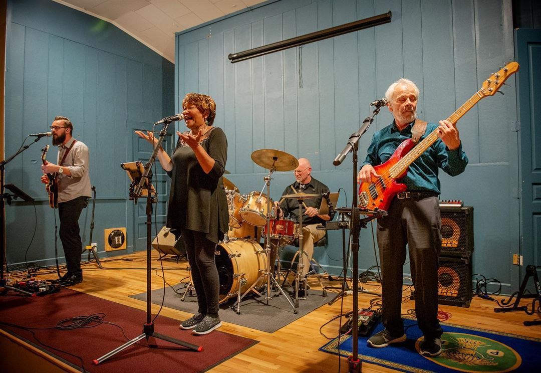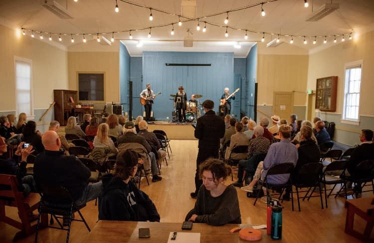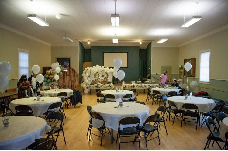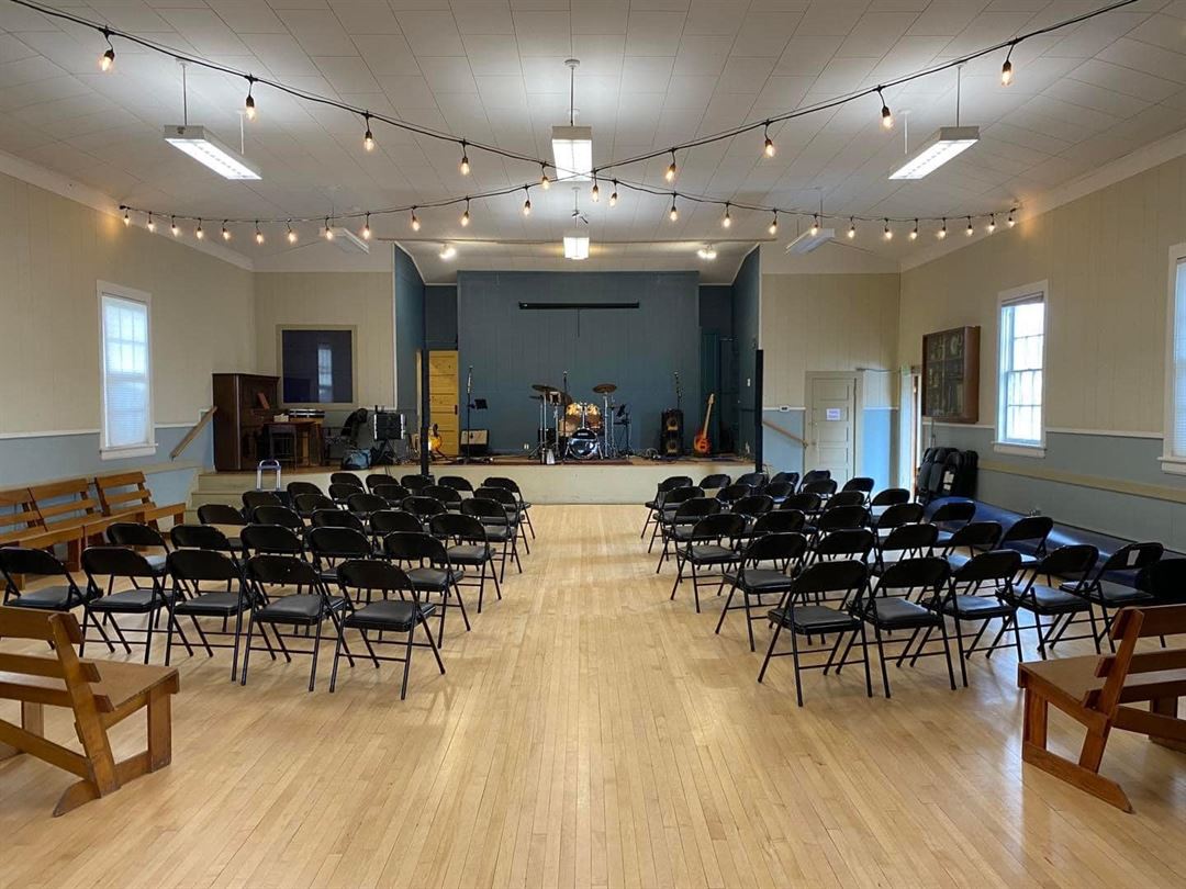 The Crescent Grange building is 100+ years old, has a lovely hardwood floor creating an excellent acoustic space for live performance. It's a great dance floor, with a stage that can hold 10 musicians comfortably. Tables, cloths and chairs are provided.
