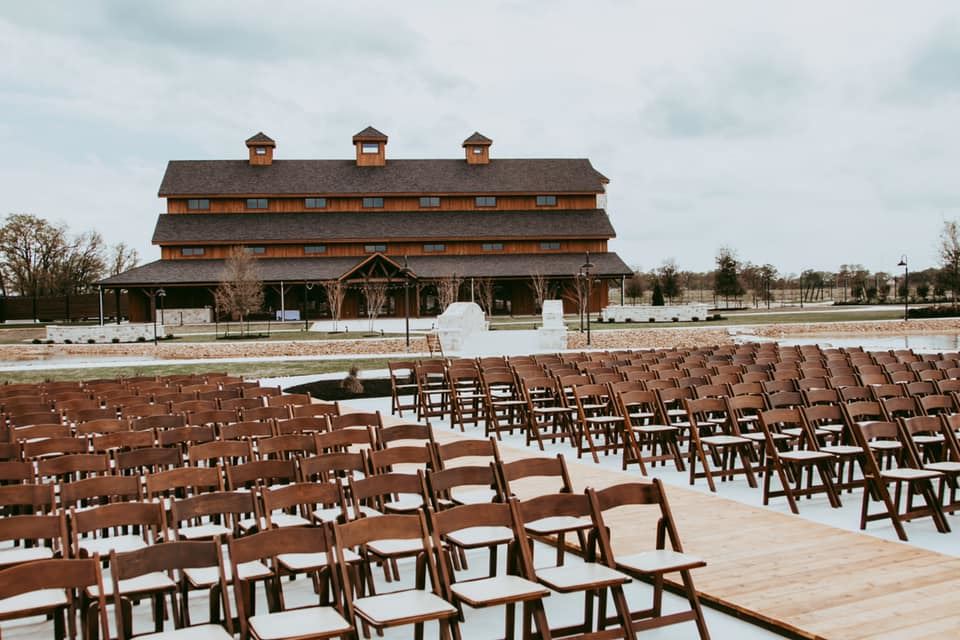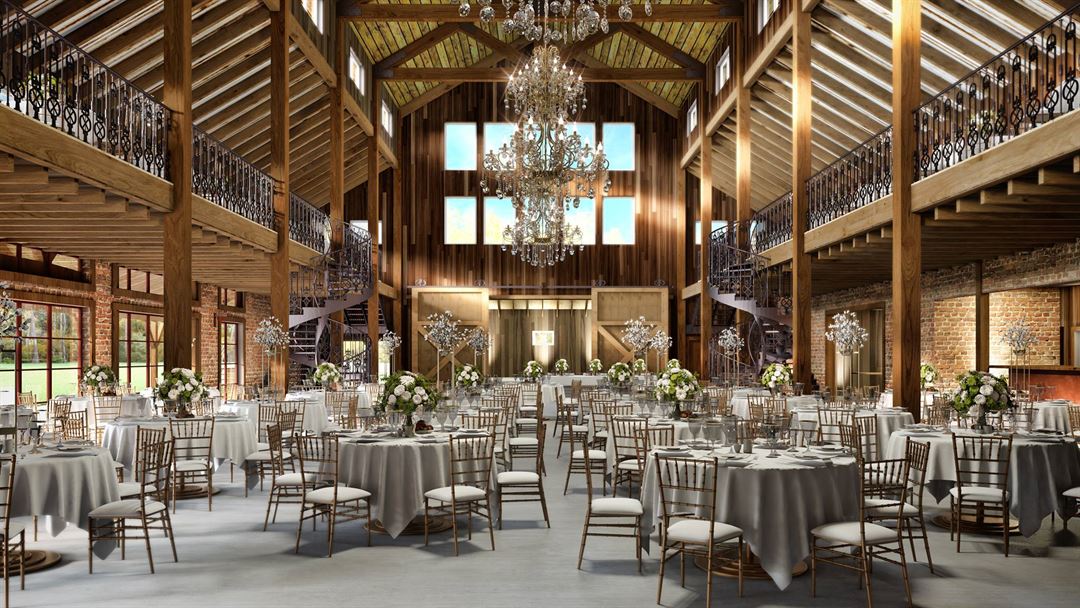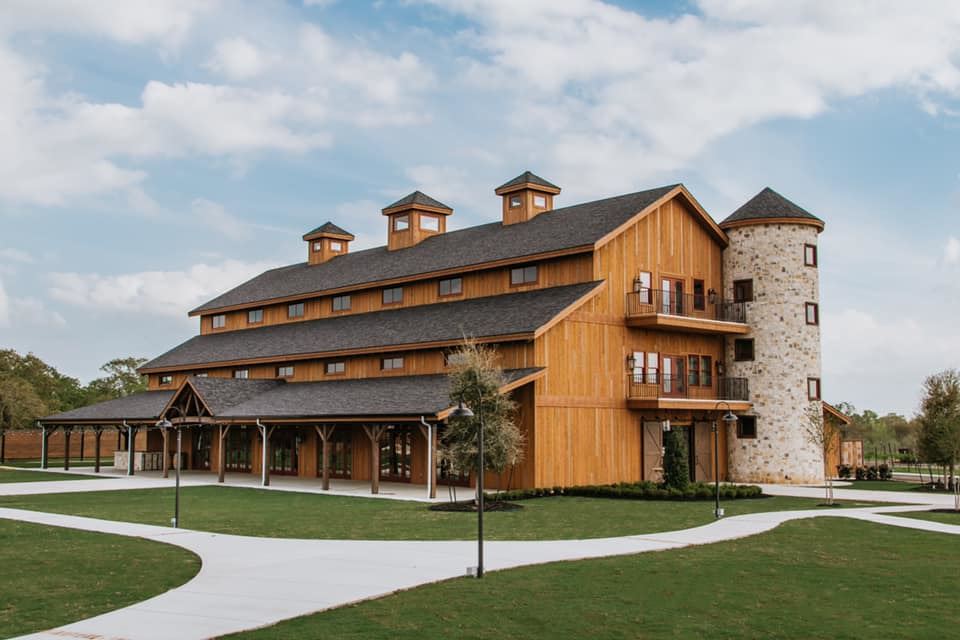 This vineyard-inspired wedding venue sits on 100 beautiful acres. From the barn, visitors look across the serene pond at rows of lush grapevines, a cobblestone bridge, and a dense tree line. The three-story wooden barn is complemented by a handcrafted limestone 50 foot silo to create a stunning exterior appeal. Within the barn you will find an elegantly rustic atmosphere with reclaimed wood, brick, and refurbished tin offset by stunning chandeliers decorating the entire length of the grand hall providing a breathtaking first impression. At the outdoor ceremony site overlooking the pond, bride and groom exchange vows atop a grassy knoll with rows of sweeping grapevines creating a picture perfect backdrop. Our 18,600 square foot barn is sure to satisfy even the biggest of celebrations. We would love to chat with you about your special day.