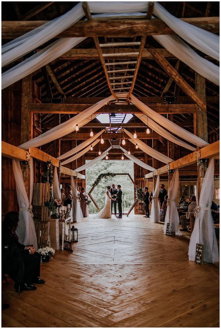 Bonaventura Vineyards is a wedding and event venue on 86 acres with an 1800’s barn renovated for receptions and/or ceremonies. The barn includes a built-in bar, built from reclaimed wood from the barn. Along the waterside of the barn is our spacious deck, great for watching the sunsets over the water! We have farm-style tables built on site with reclaimed wood from the barn and basic folding chairs to accommodate your guests (the barn can seat 150 guests). We have plenty of space on the grounds for outside ceremonies overlooking the vineyards, water or even a wooded ceremony. We have close to 1,000 grapevines (red and white varieties) that we have been planting each year since 2015. Future plans include a winery and tasting room area-check back for updates on this part of our business! Thank you for your interest in Bonaventura Vineyards, contact us today for a tour!