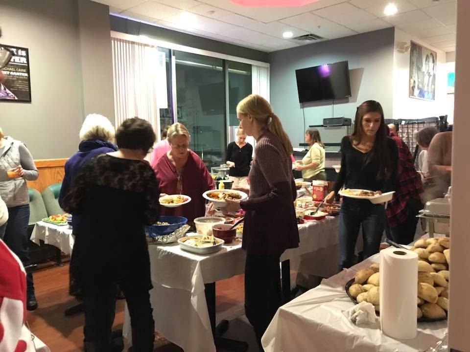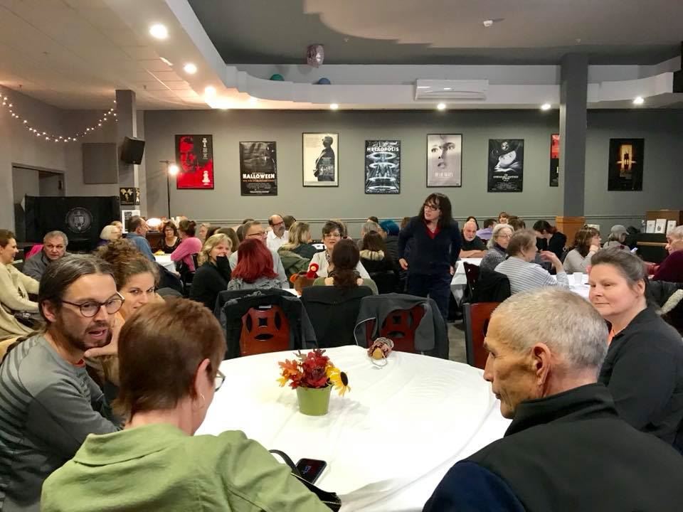 Then we came across The Screening Room in Amherst, NY. It's known mainly as a place to see independent and classic movies while sitting at a table enjoying food and drink. They also rent their space out for private meetings and events. They seemed to meet our needs perfectly: We could bring in our own food, although they did have catering options if desired. We did need to purchase any alcohol from them, but the prices were reasonable. We had use of their sound system, which we plugged into a laptop to keep music going. I was also able to use their screen to display a brief PowerPoint presentation (and use their microphone to narrate). Wireless internet access was also available throughout the room.
