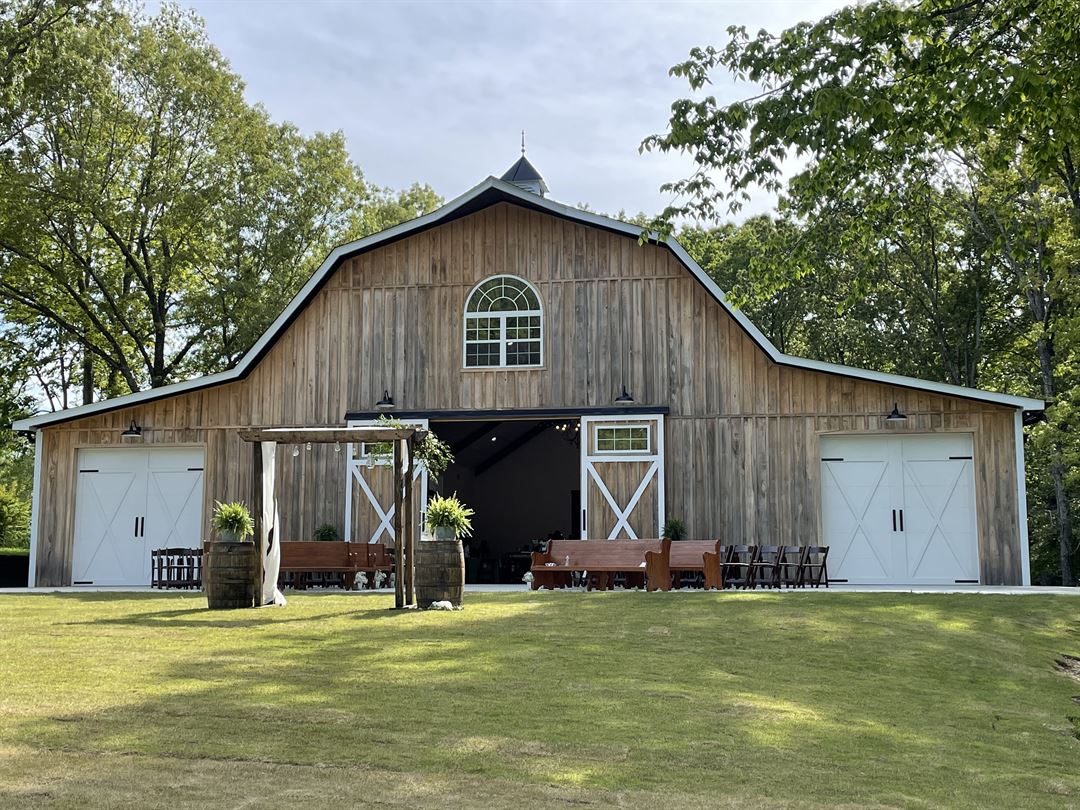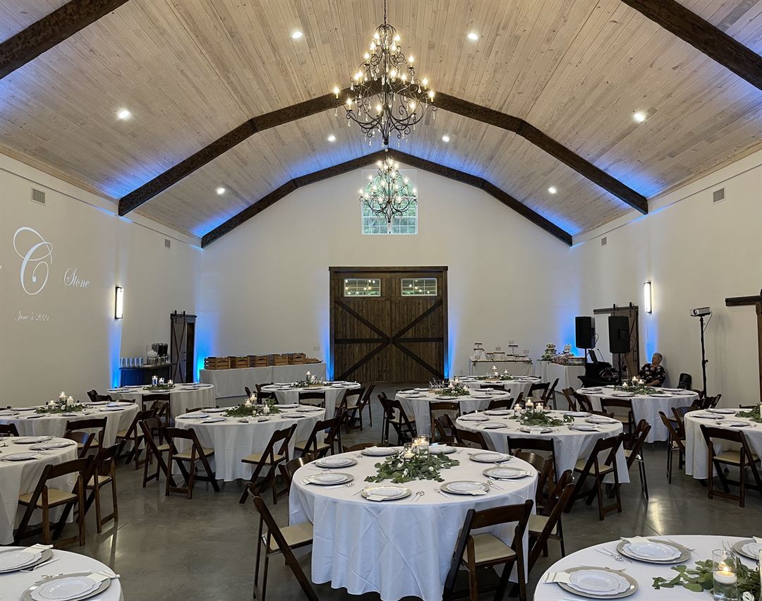 Every detail went into the design and appointments so you can host the perfect wedding or event. The barn’s Great Room with 32ft. ceilings, beautiful wrought iron/crystal chandelier, glass sconces, and 14ft sliding doors on each end of the great room that can be opened to the outside, make the barn the perfect combination of rustic and chic! Even the weather vein that sits atop the barn was custom designed by an artist to depict a whimsical flying pig blowing his trumpet as he rings in the celebration. Make sure to check him out when you visit!