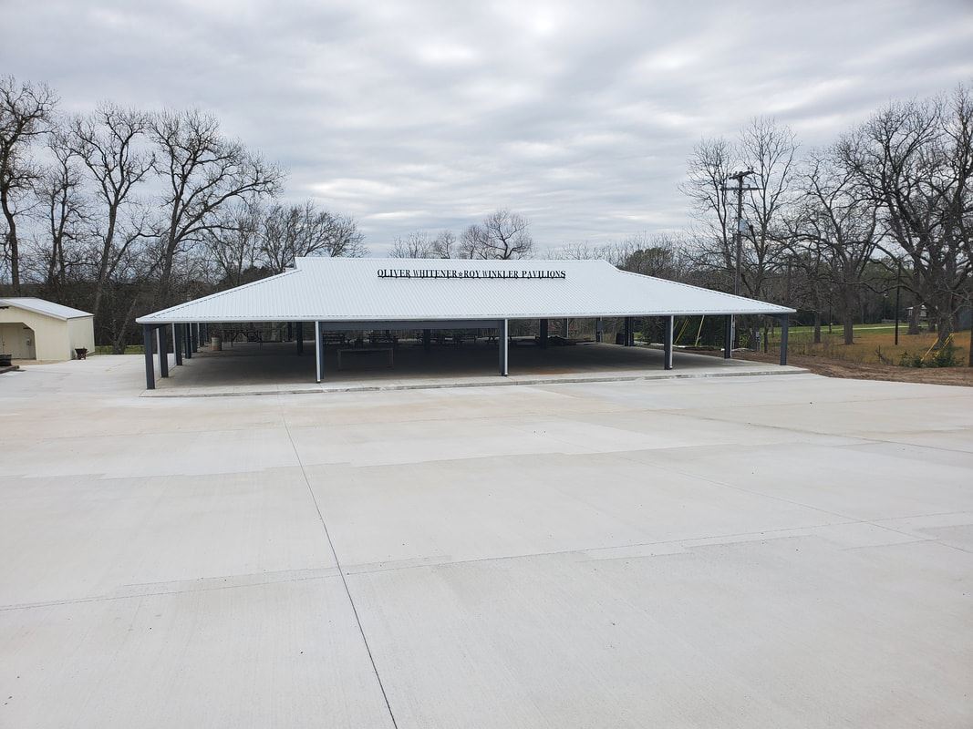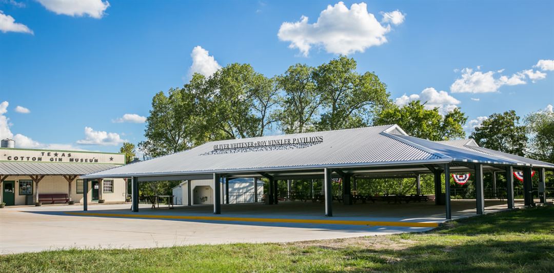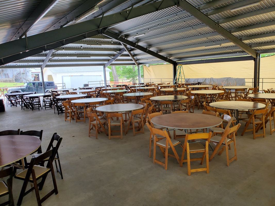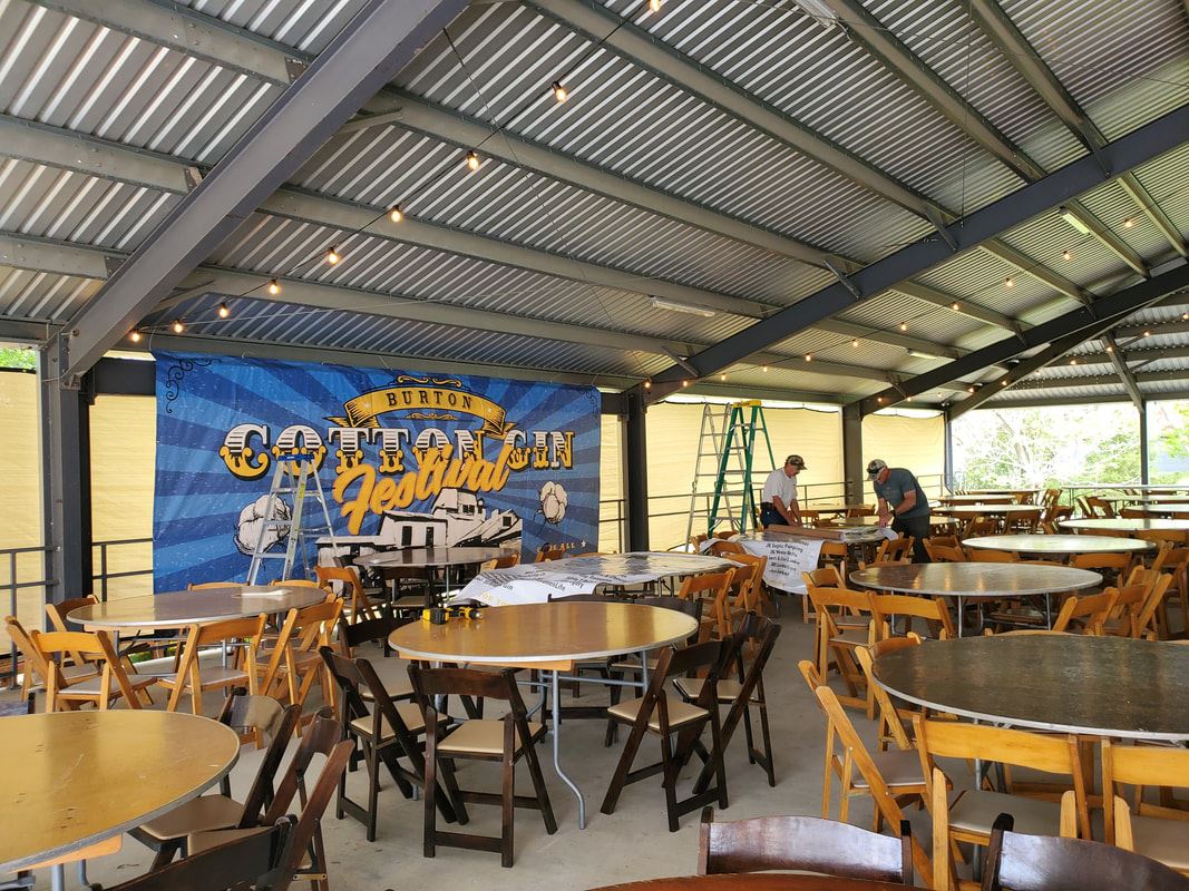The Roy Winkler Family Pavilion is a 90'x 50' covered Pavilion, complete with outdoor restrooms, picnic tables, overhead lighting, electricity, and a stage if requested. This space is perfect for reunions, graduation parties, wedding receptions, or even small live music events. Enjoy all this with the iconic silhouette of the Burton Farmers Gin in the background.