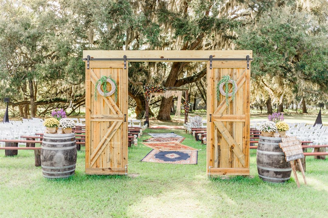The Red Barn is a charming event venue located in Bushnell, Florida, 30 minutes to an hour from many Central Florida towns (including Tampa, Ocala, Orlando, Lakeland, Dade City, etc.) The drive in, a lovely country road with a gorgeous canopy of trees, provides an enchanting passage toward your dream event. Ten acres of beautiful, sunny, Southern Florida farmland, complete with plenty of majestic oak trees to afford a variety of shady choices for your ceremony or event.
