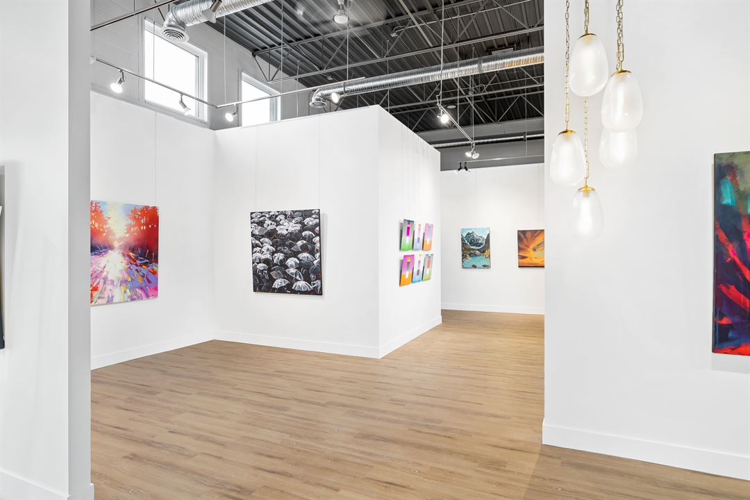 Our newly renovated space can be found in the heart of the Barley Belt in Calgary. With just over 2400 sq. ft. of space, our contemporary art gallery is a blend of industrial chic and modern sophistication. This large space features light wood floors, clean white walls, 18 foot ceilings with exposed beams, natural light which is augmented by track lighting and a collection of chandeliers, and a baby grand Yamaha piano. The gallery is air-conditioned, and also features a Sonos sound system. There is a bar area, two restrooms, and a small kitchen with a refrigerator, microwave and dishwasher.