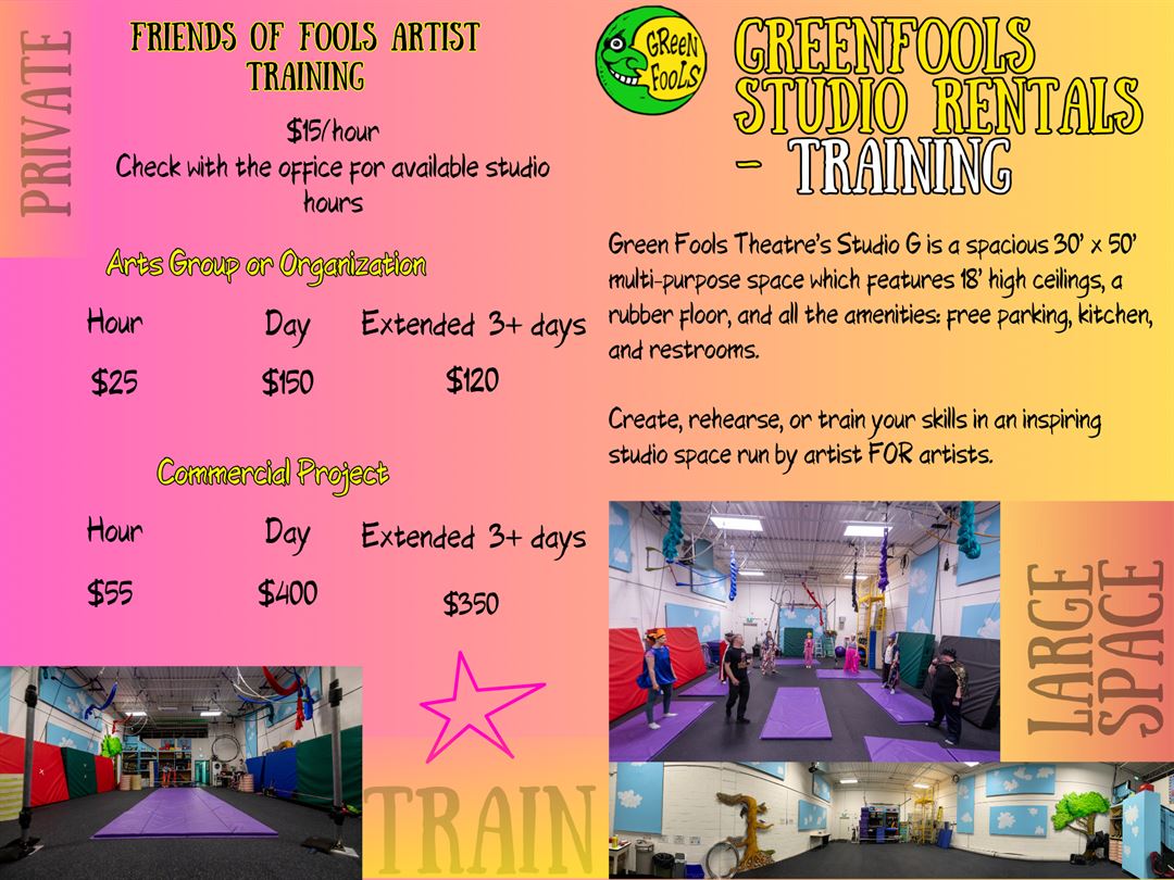 Are you a theatre or circus artist, an arts organization or collective, or a commercial team looking for the perfect space to create, rehearse, brainstorm or train in? Green Fools Theatre’s Studio G is exactly what you need!