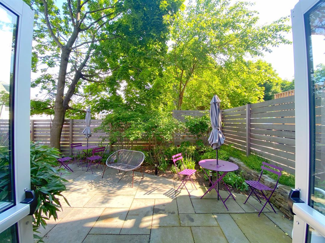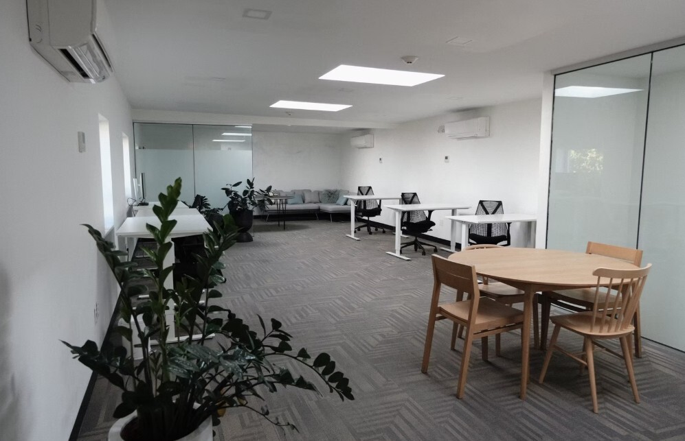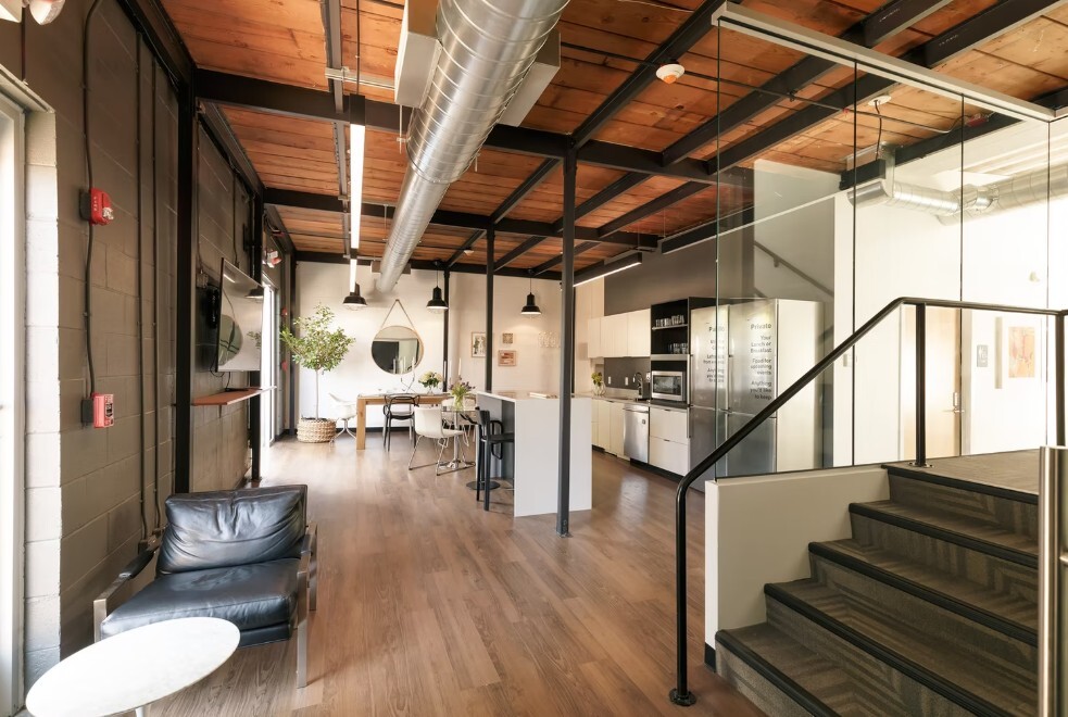 Our building went through a complete restoration but kept its original reclaimed wood ceiling beams and charming details. Our 3,000 square-foot interior space, with 12' ceiling height, boasts natural light from the front windows and skylights, and indoor-outdoor space with lush backyard garden is perfect for office, corporate off-site meetings and filming, photoshoots and more. Modern designer furniture together with creative original art from European and local artists create a vibrant and productive work space.