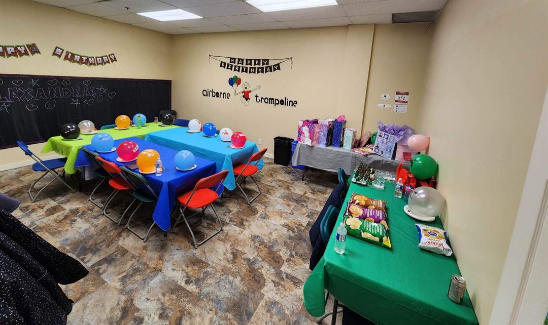 Get private use of our bouncy Olympic trampolines for an exciting hour that is coached, structured and action packed with games, high energy music, and a live performance at the end of flips and more from the trampoline coach. The birthday child also gets to soar high in our bungee (optional). The following hour is spent in one of our decorated, private birthday party rooms; however, the party room is yours for the duration of the two hour party. Choose from our catered or non-catered options.