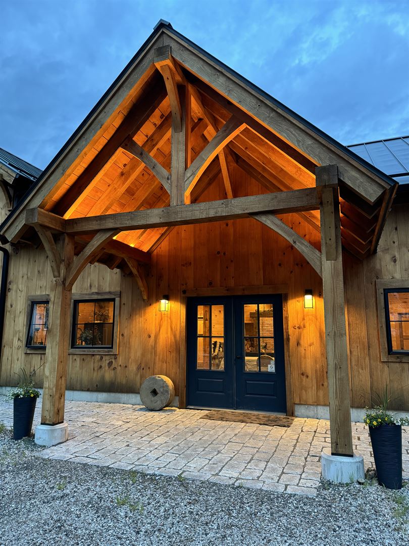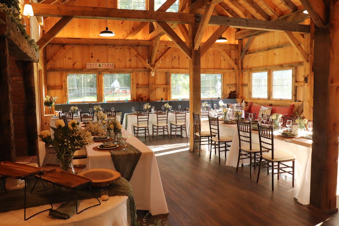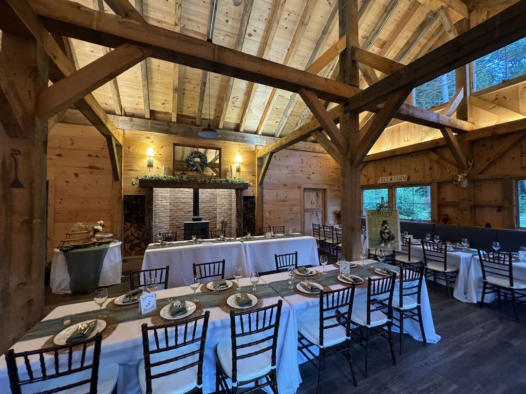 Unique upscale barn setting on a Christmas tree farm with horses, donkeys, goats and our 2 highland cows! Beautifully decorated in a custom Timber frame barn milled from timbers from the property in 2021. Bar area with custom upholstered bar stools and wide plank wood bar top. Sitting area can be utilized in front of the charming wood stove, or more tables can be added. We also have custom built in booth seating. A large indoor bathroom and even a separate men’s urinal.
