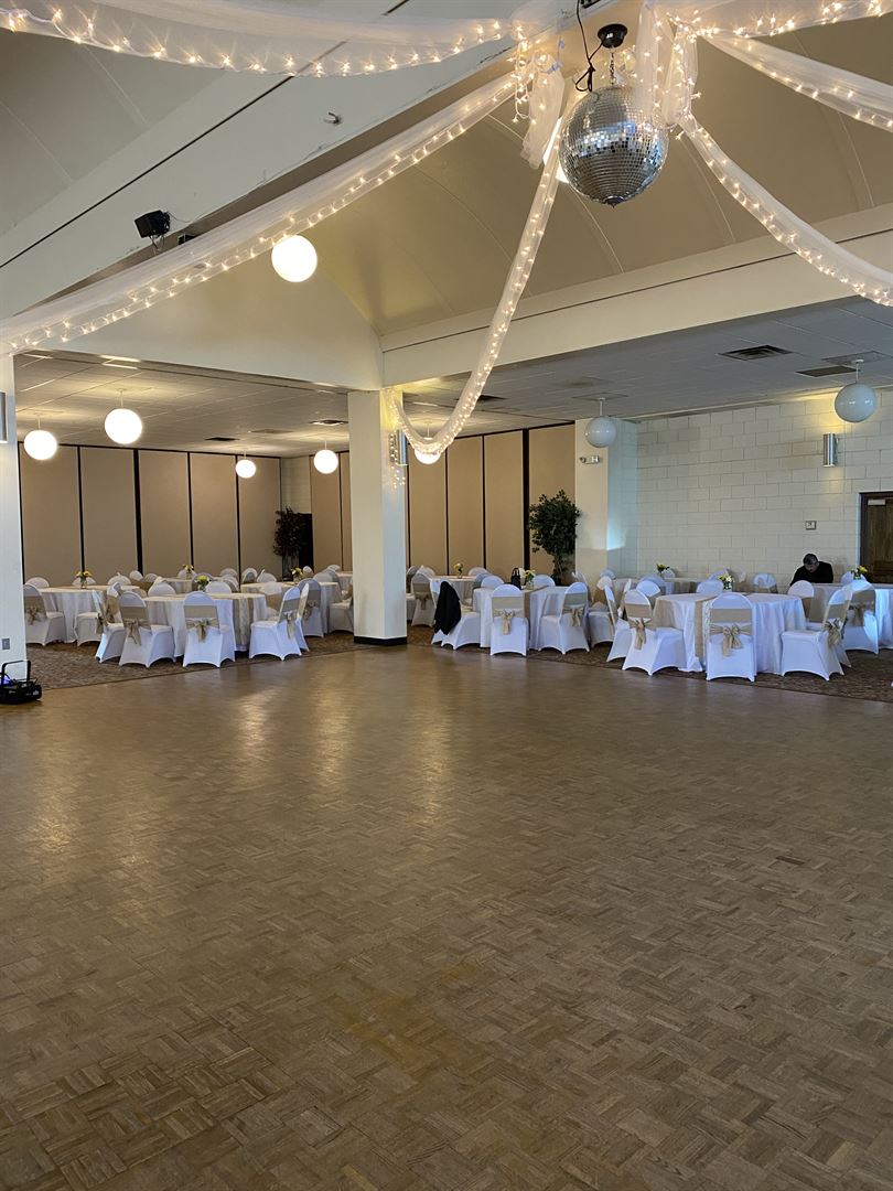 Our hall can accommodate up to 375 people, but it can also be divided into 2 smaller rooms if needed. It has a huge dance floor, a big bar and a large foyer. It is also handicap accessible.