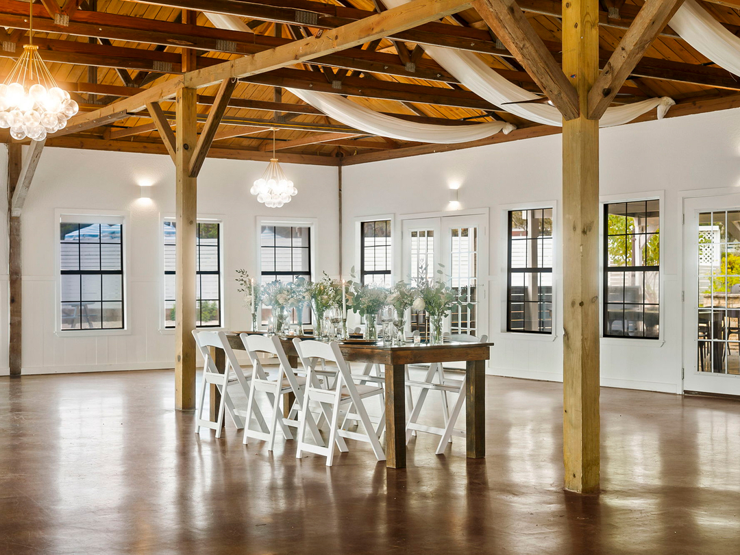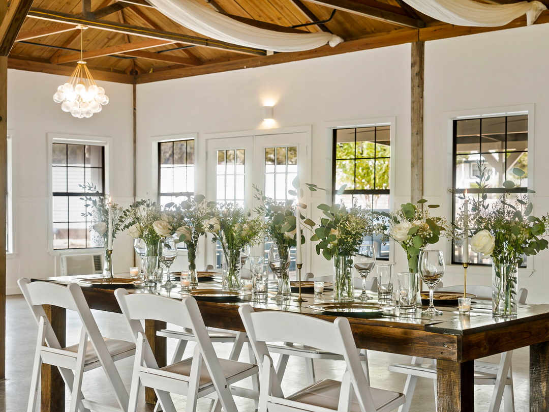 The Patio: a spacious covered patio with farmhouse tables offers additional seating and is the perfect setting for a cocktail hour.