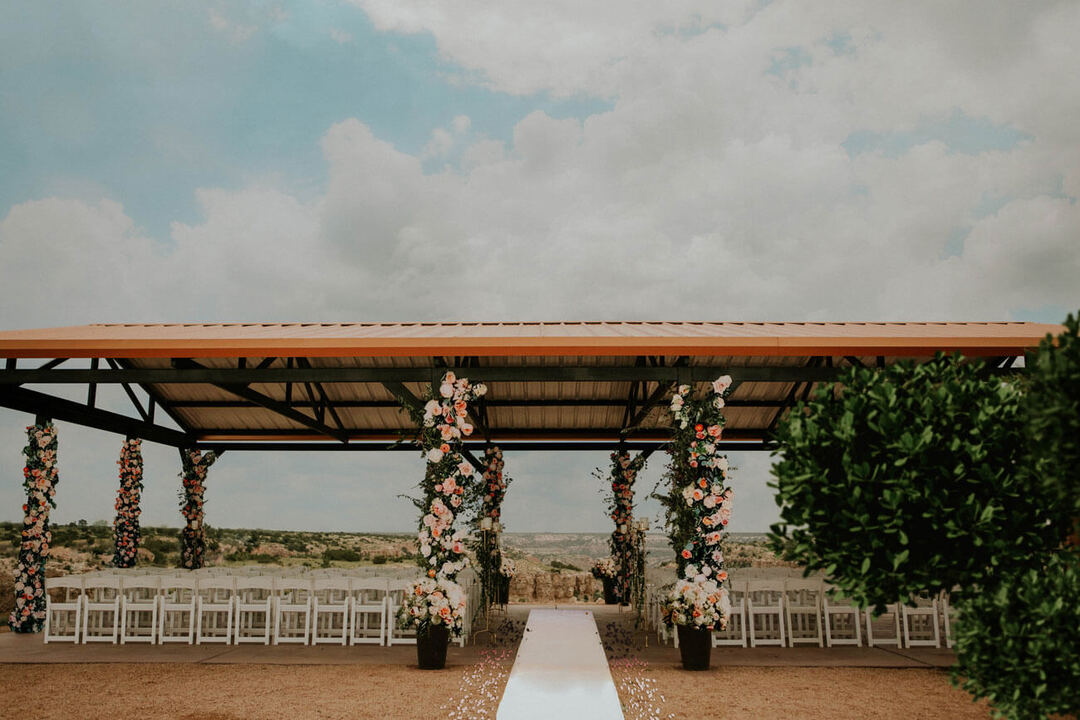 The venue at Doves Rest Resorts at Palo Duro Canyon, Texas, Tres Vientos (Spanish for three-winds), is truly a one-of-a-kind event venue. Perched on three sides of a sheer one-hundred foot drop-off, it offers panoramic views of Palo Duro Canyon. Meticulous planning went into the construction to preserve the natural beauty around the patio. One of the many stunning elements of Tres Vientos is the natural walkway with steel railings around the structure that brings your guests as close to the edge as possible with no steps for easy access for mobility impaired guests.