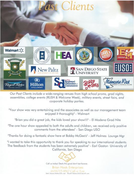 Hypnosis shows available nationwide. Venues include Proms, Grad Nights, College Events, Fundraisers, Fairs & Festivals, Pride Events, Corporate Parties, Military Shows, and Cruise Ship Entertainment. As seen on BlindDate, FOX, Montel Williams, Howard Stearn, and Sally Jessy Raphael. Brian was also the opening act for national rock band Lovin Spoonful (hits include Do you believe in magic & Summer in the City) and national comedy team Williams & Ree.