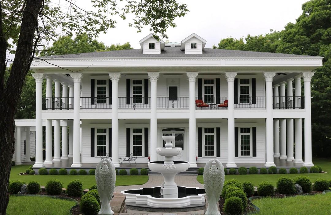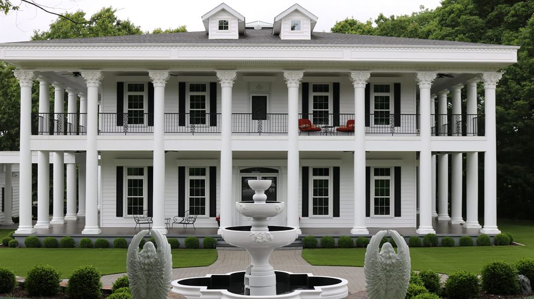 The exterior of the mansion has a 16’ tall black and white fountain in the circle driveway and a 10’ wide porch on two levels. The interior of the building has 37 crystal chandeliers, marble and wood floors, two Italian fireplaces and a theater.
