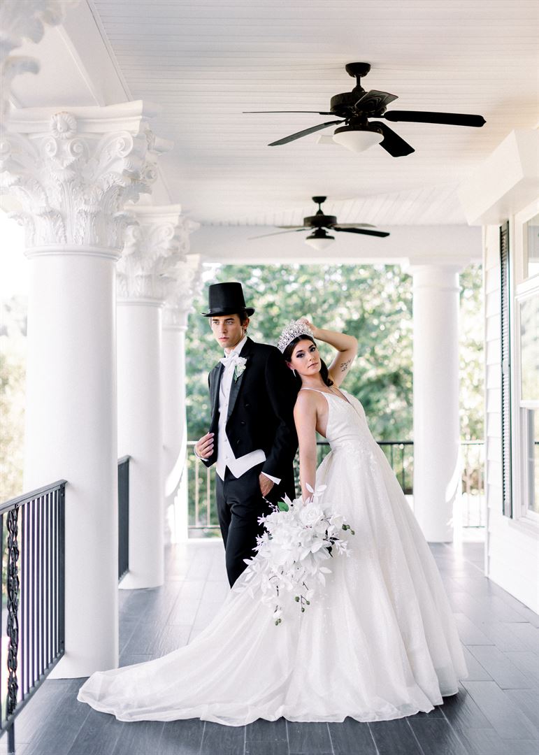 There is also raised platform seating for the bride and groom plus an elevated second story for the band or DJ with a glass railing and tech hookups. The hall comes with 6’ round tables and Napoleon chairs for 200 guests.