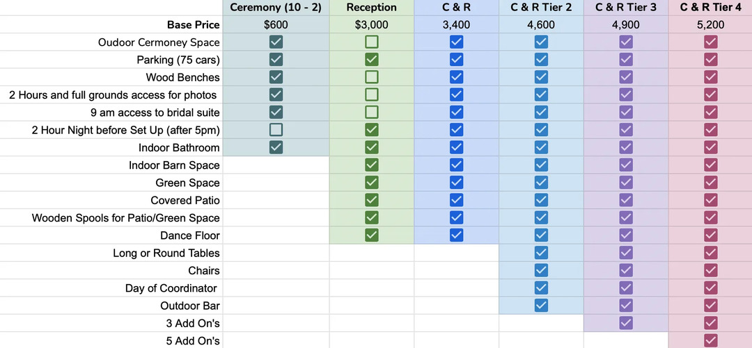 Cocktail Space, Inside/Outside Bar, Upscale porta potties, Flexibility in catering & music entertainment, Access to Orchard and Pond Area, Parking, Day Of Coordinator