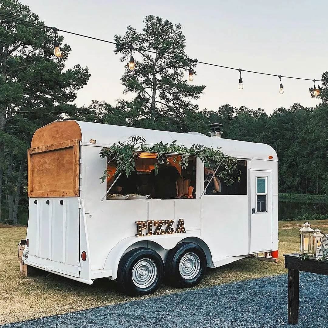 Wood fire pizza food truck in an old horse trailer. All you can eat pizza buffet from a food truck.