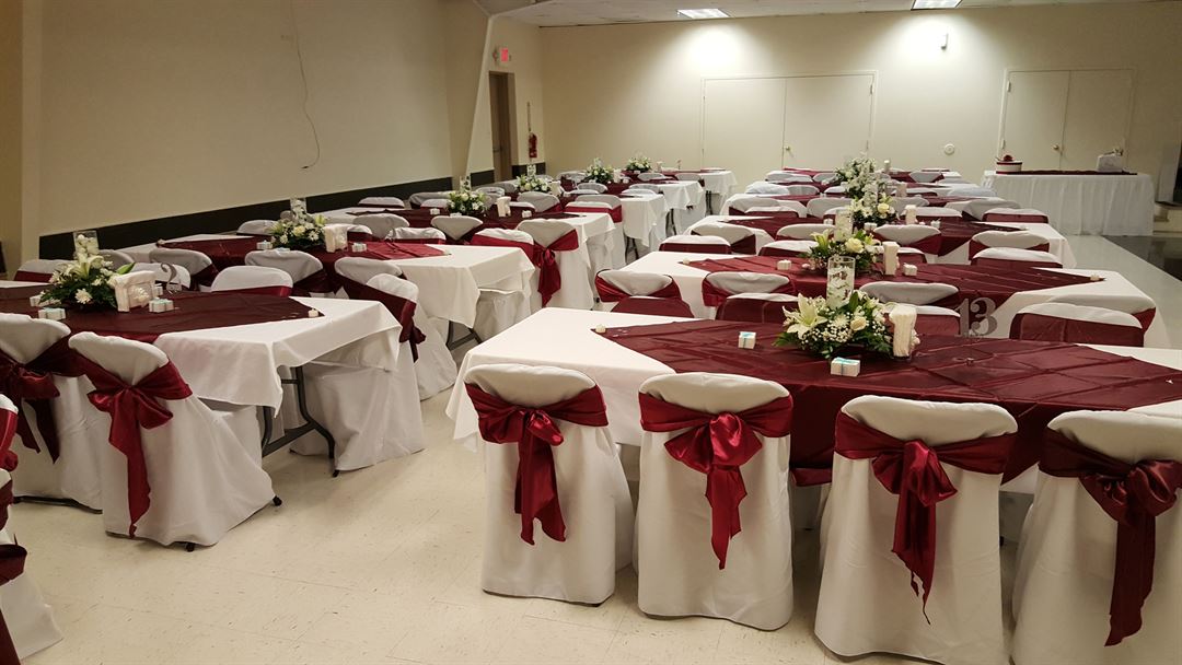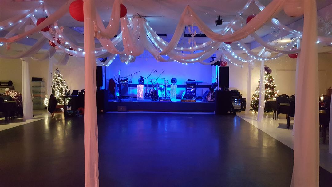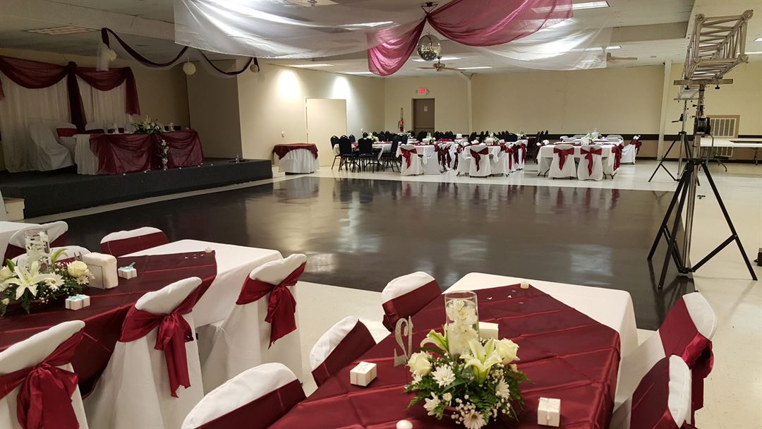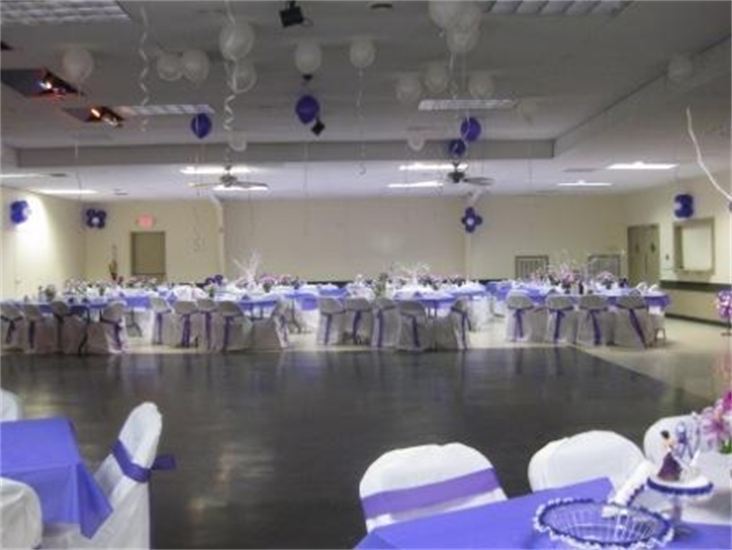 Seats up to 250 guests using on-site tables and chairs included with the rental fee. Amenities include a stage, dance floor, bathrooms, and an enclosed wet-bar. Pre-prepared foods can be served from the adjoining full kitchen, with ice machine and separate refrigeration for your event.