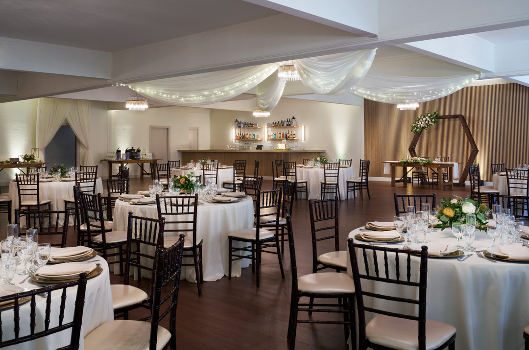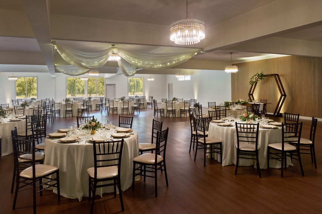 Inside the elegant yet laidback grand hall, guests will enjoy dining and dancing in a spacious and inviting atmosphere. The built-in dance floor encourages everyone to celebrate, while the chandeliers and neutral color scheme provide a blank canvas for you to personalize the space with your own décor.