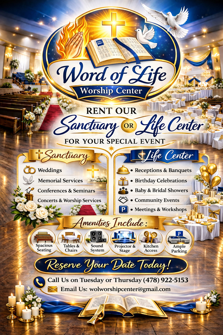 Ideal for weddings, memorial services, conferences & seminars, concerts & worship services, receptions & banquets, birthday celebrations, baby & bridal showers, community events, meetings & workshops