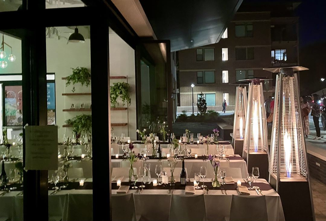 There are tall windows all along the side and front of the restaurant, with custom blinds to be used as preferred, and the front wall of windows opens up completely to two patios out front, with a nana wall and motorized screen option. There is also a small park across from the front patio with Adirondack chairs, too. Stylish heaters can be added for any outdoor events on cooler evenings.
