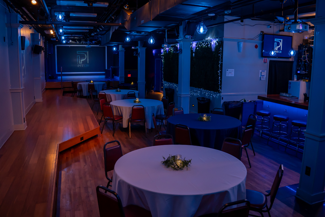 Versatile venue and full bar with stages, projectors, and professional sound and lighting systems for parties, networking events, banquets, concerts, and more.