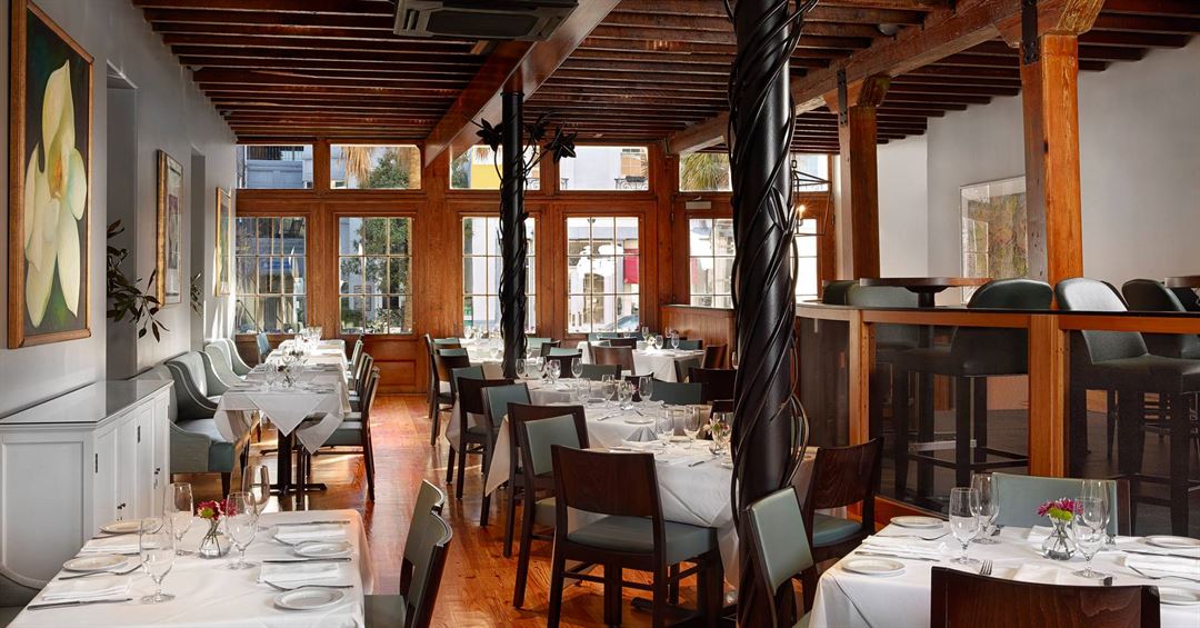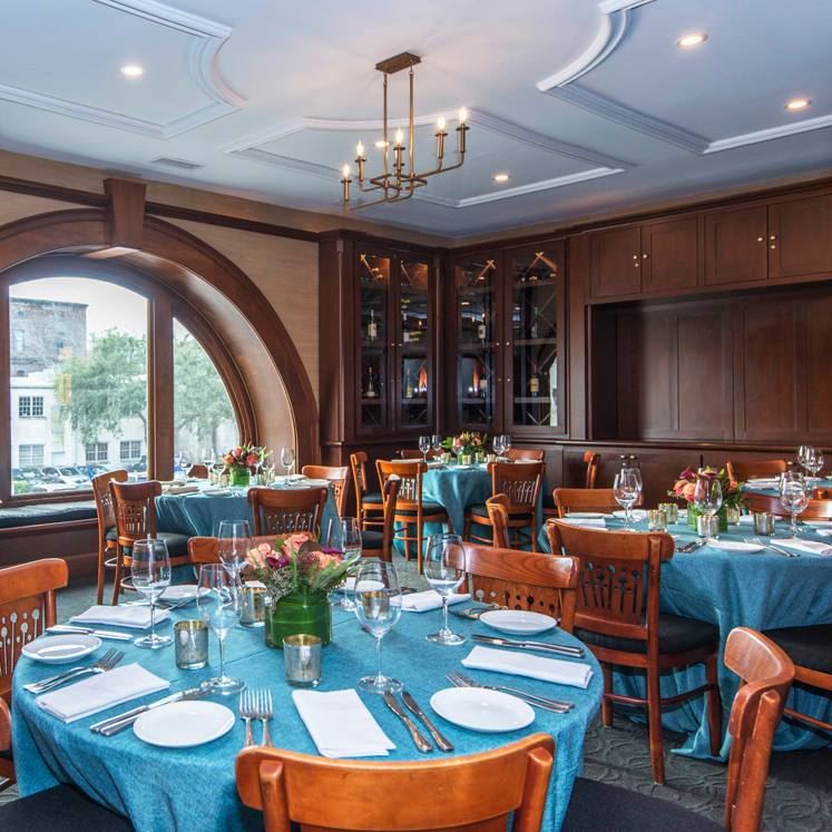 The Wine Room can accommodate up to 36 guests and features a beautiful bay window overlooking Charleston's historic district. Alternatively, the Primrose Room comfortably seats 78 overlooking Lodge Alley and its neighboring courtyard.
