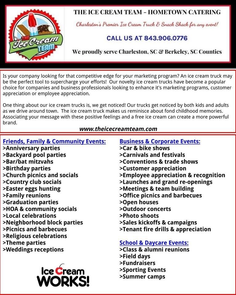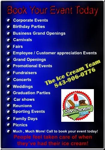 The Ice Cream Team will come to any event, party, churches, charity events, picnics, schools & daycare's, summer camp, After-school programs, fundraisers, weddings, ice cream socials, senior living facilities, employee & customer appreciation events, marketing events, reunions, grand openings, pool parties, birthday parties, sporting events, parades, corporate events, festivals, fairs, town events, neighborhood pools and community events, office events, and much more...