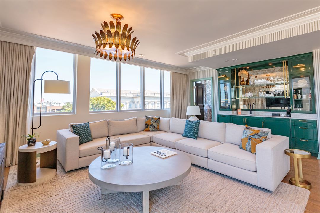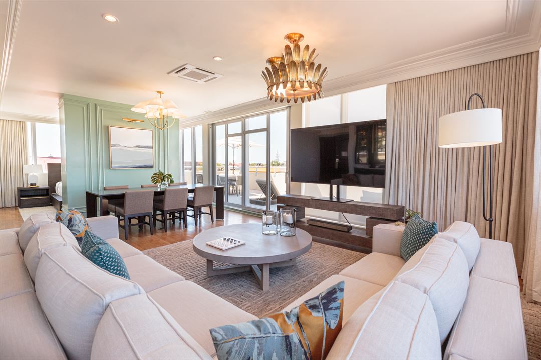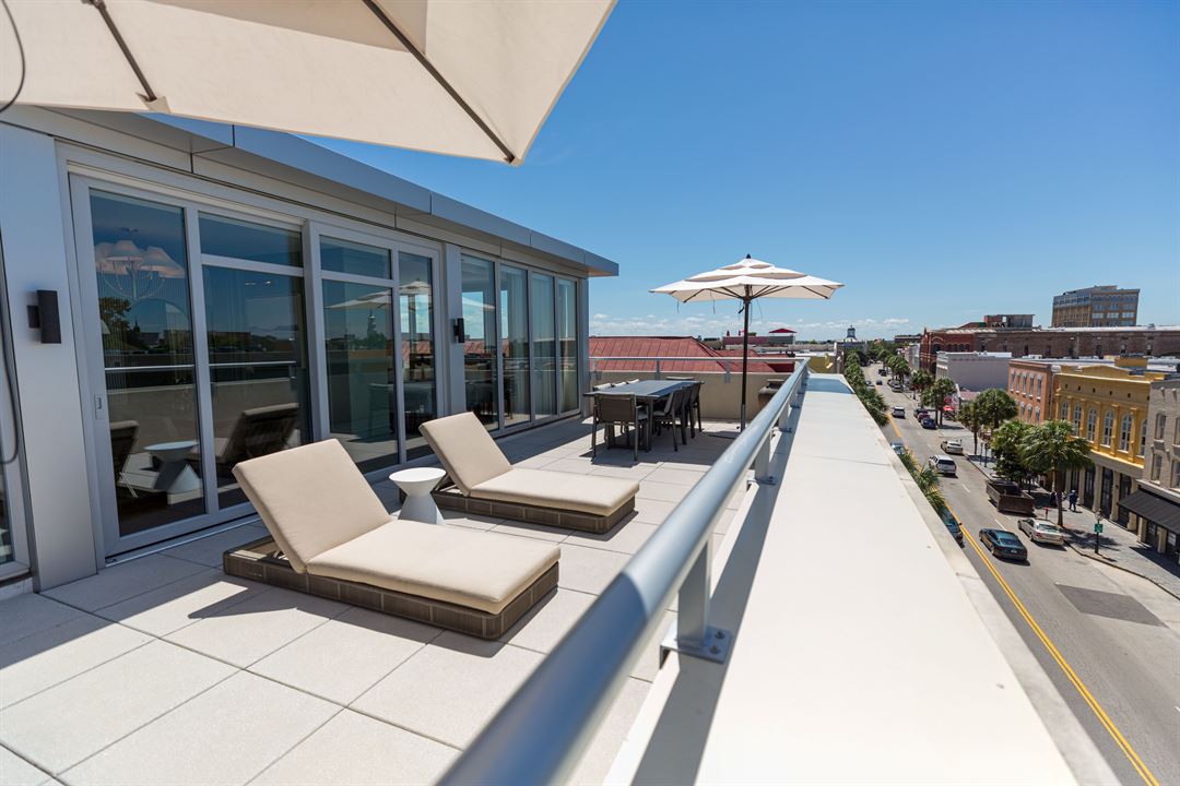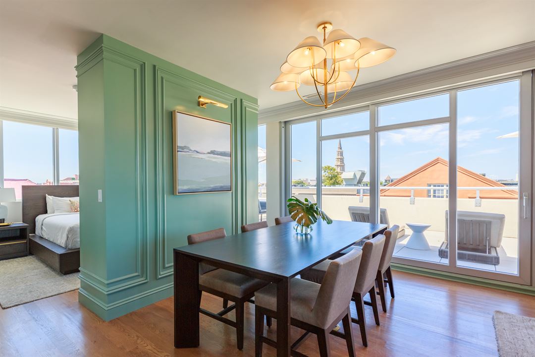 At the Palmetto Hotel, we have lots to offer. The Penthouse features floor-to-ceiling windows with a bar, lounge and dining area, and expansive 500 sq. ft. private balcony with panoramic views of the downtown skyline and iconic Charleston landmarks. This versatile space is the ideal spot for hosting a variety of events from weddings, bridal showers, farewell brunches, welcome receptions, or after parties.