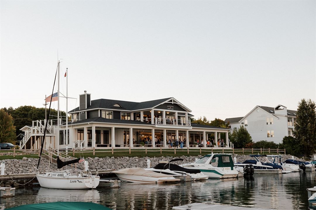 A stunning waterfront event venue for your wedding, milestone birthday, bat mitzvah, bar mitszvah, vow renewal, fundraiser, special occasion or meeting. Open year-round for public rental! We offer a large lawn and covered porch overlooking Lake Charlevoix. The large set of folding doors opens the event hall up to the covered porch, providing an open-air feel. Our building also is home to Charlevoix Yacht Club upstairs for members only and a boaters lounge for marina slip customer. We can hold up to 150 guests in the event space. Please visit our website or contact us for more information. www.cyc-events.com