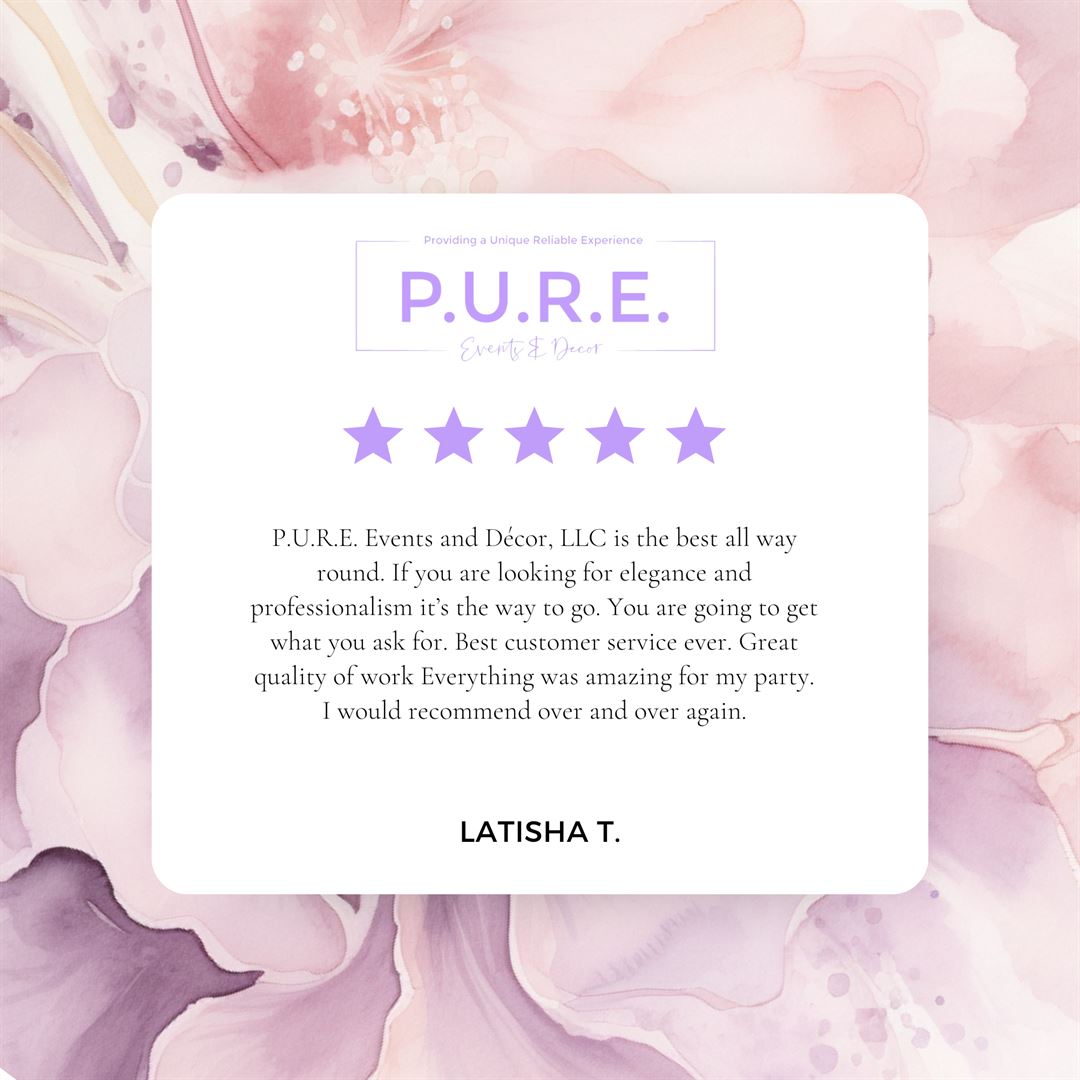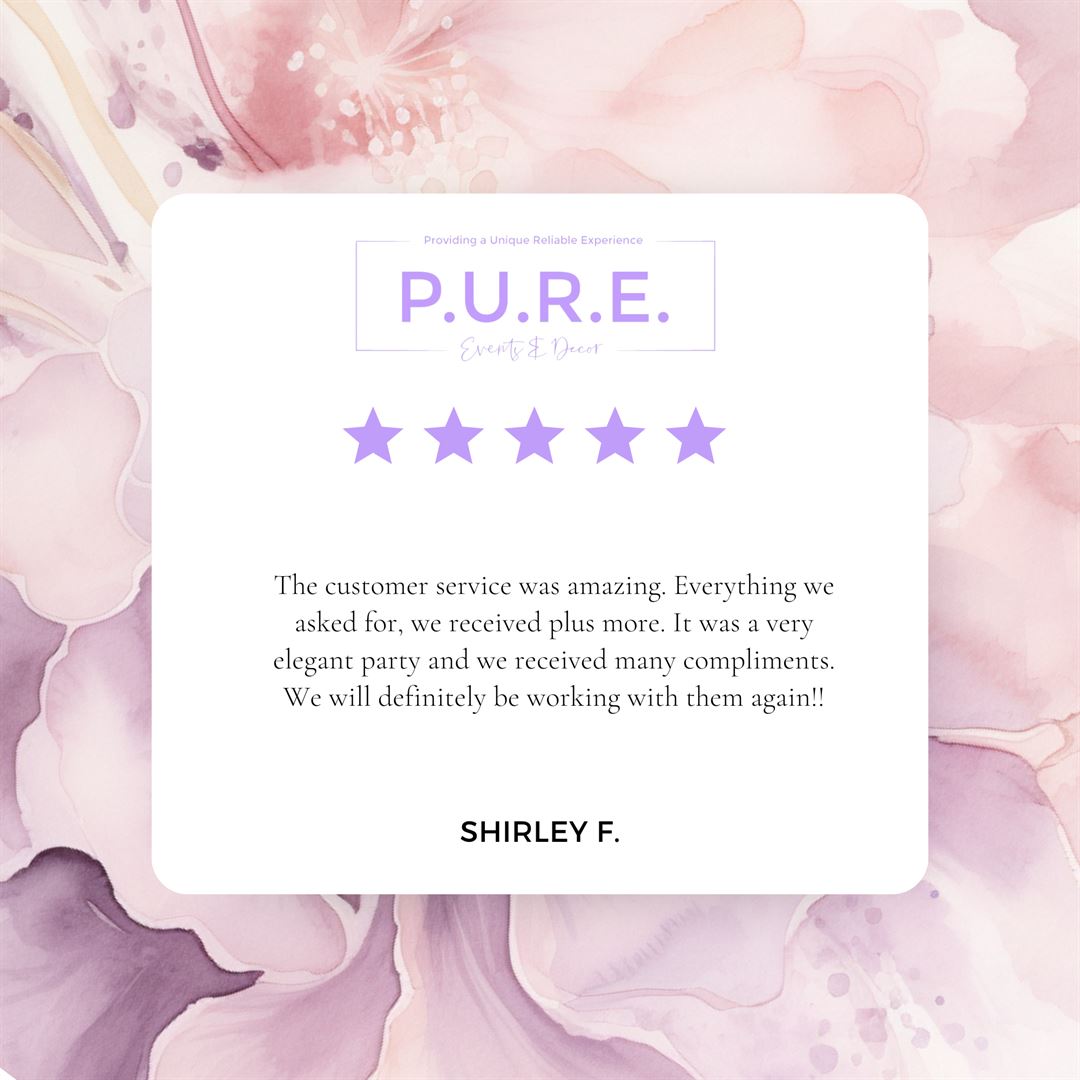 Pure Events and Decor is the best all way round. If you are looking for elegance and professionalism it’s the way to go. You are going to get what you ask for. Best customer service ever. Very reliable. Great quality of work Everything was amazing for my party. I would recommend over and over again.