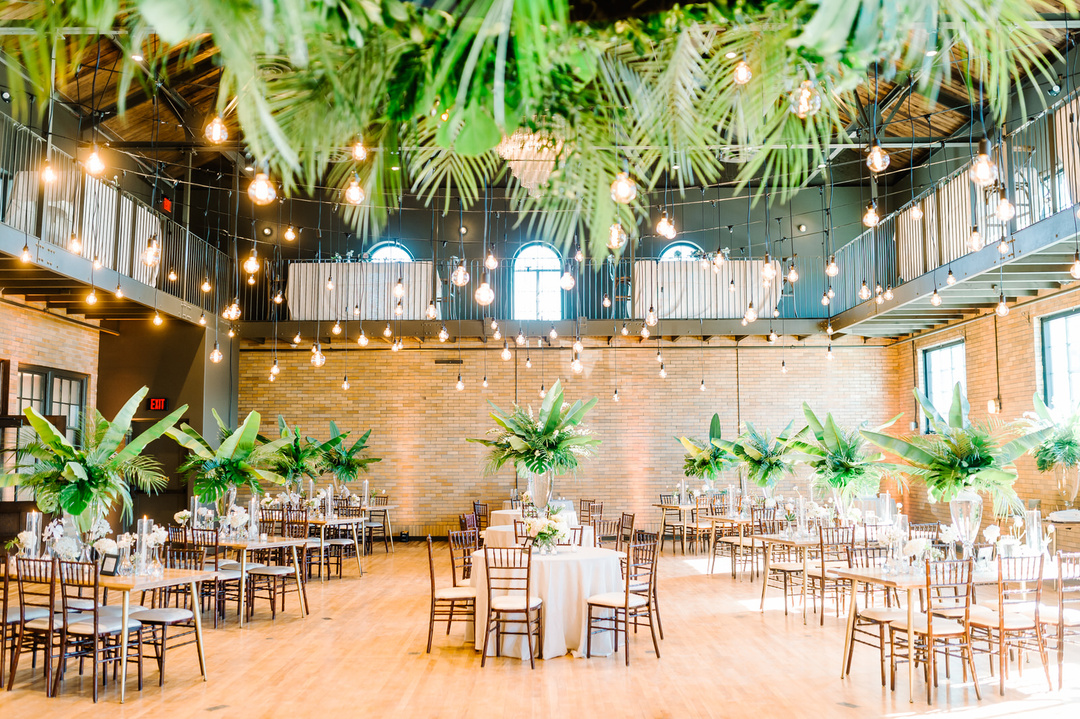 Ruby Hall, the flagship venue, accommodates reception parties from 50 to 175, where natural lighting, exposed brick, and chandeliers fill the space with a rare ambience. The mezzanine level gives newlyweds a bird's-eye view of their celebration, and the built-in stage provides a natural location for a live band or DJ.