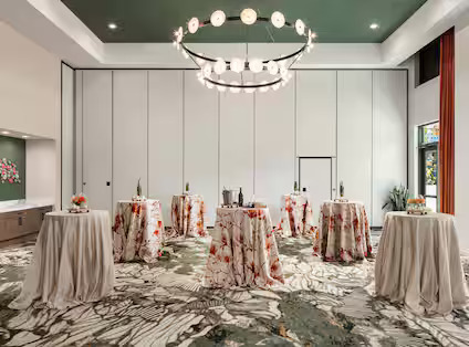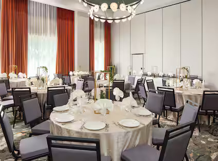 Our stunning ballroom offers a sophisticated and flexible setting for your next corporate gathering. With high ceilings, striking modern chandeliers, and expansive windows that flood the room with natural light, the space blends contemporary design with timeless elegance.