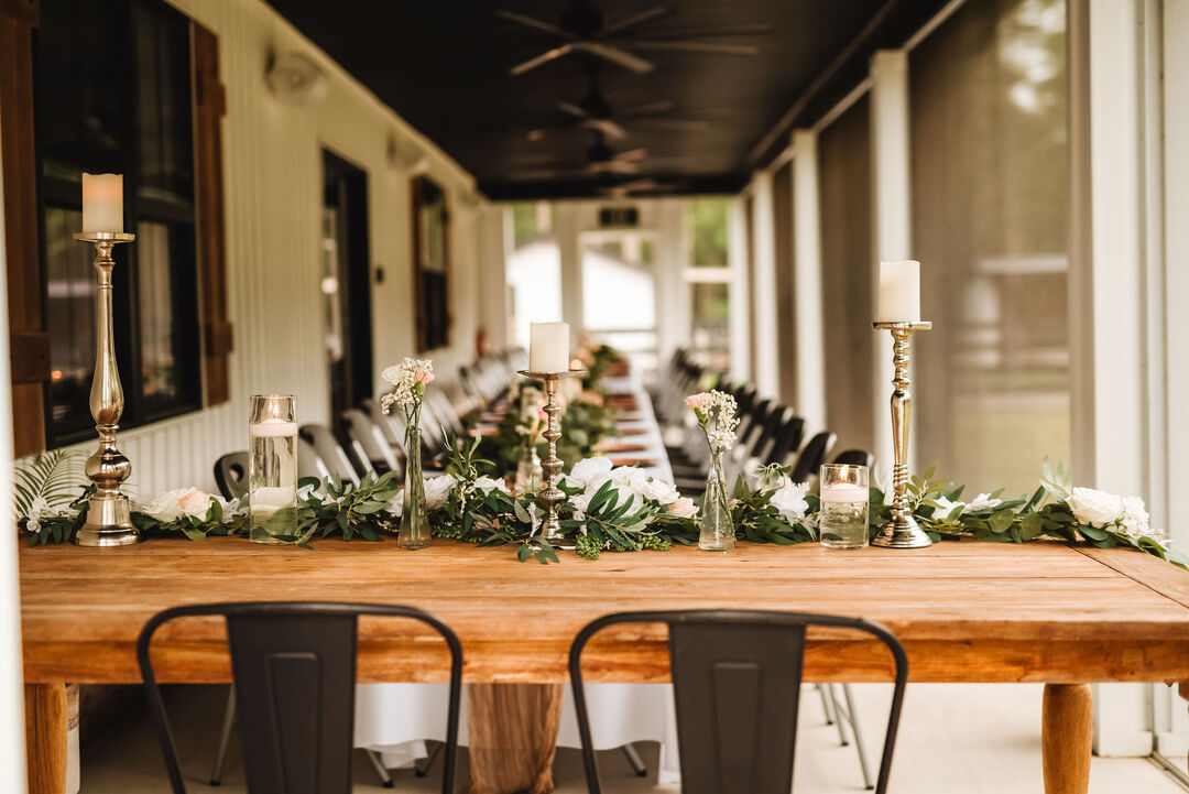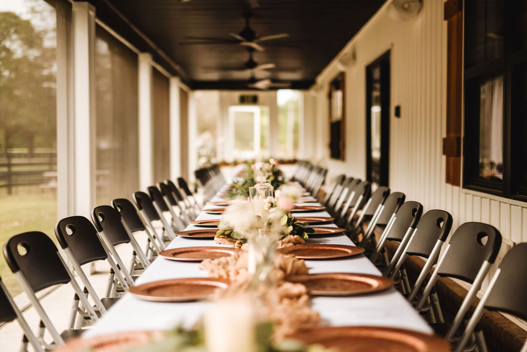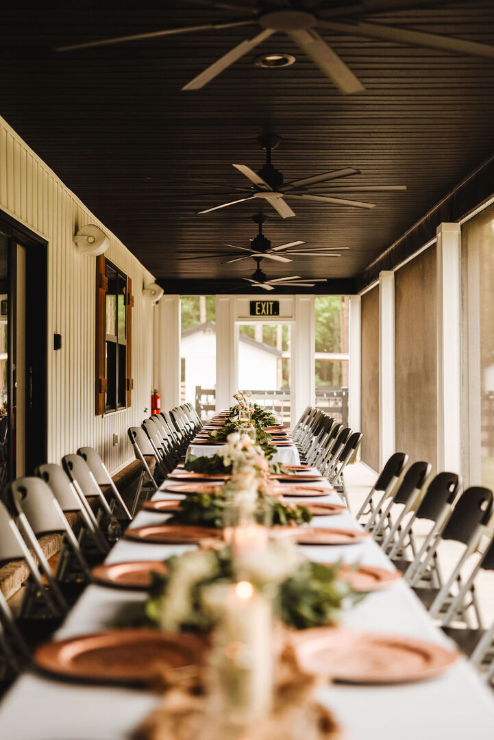 The caterer's smoker was set up on the gravel surface next to the barn, which was convenient. We set up the mains and the side on a table under the covered porch area. Our caterer was Bullet Smoke BBQ and we HIGHLY recommend them to anyone! Everything was delicious! We had the barbacoa, pork belly bites and chicken drums along with yummy sides. Brent is your man!