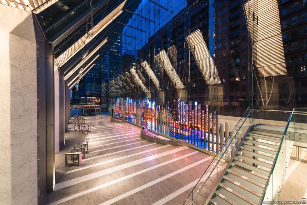 Its dramatic lobby, (nearly 100 feet tall at its peak and surrounded by a completely transparent structural glass fin wall system,) welcomes visitors and visually blurs the distinction between interior and exterior space. 150 North Riverside’s lobby also features the largest digital art installation in Chicago, the award-winning ‘150 Media Stream’.