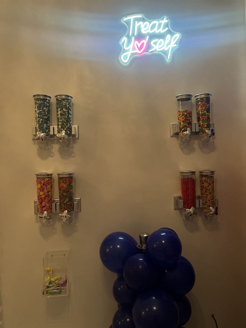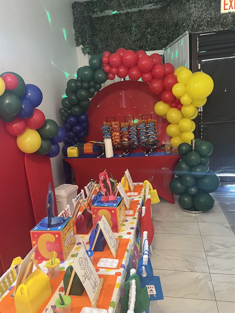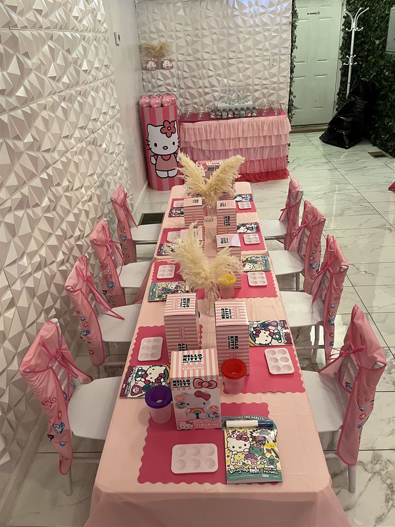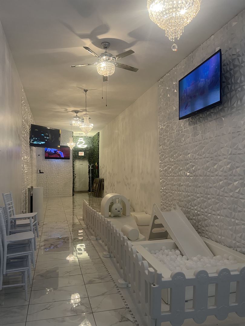 Luxury children’s party room. Ideal space for all children events. 600 sqft. Marble floors, crystal chandeliers, stainless steel ceiling fans, 2 kid tables, 10 kid chivari chairs, 3 white cake columns, candy treat wall, video gaming wall and Bluetooth speaker
