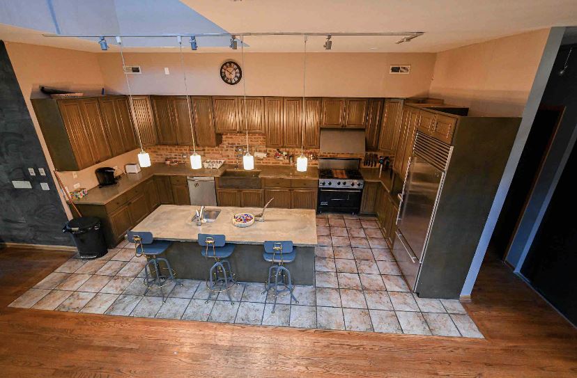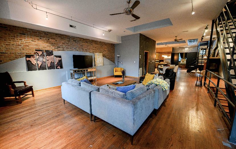 Perfect for family and friend gatherings, events, filming, and exhibits, this duplex loft is located right in the center of the neighborhood across the street from the Damon Blue Line stop. Designed in the 90s, this unique home offers a complete open space connecting the living room with the dining area and the grand kitchen space.