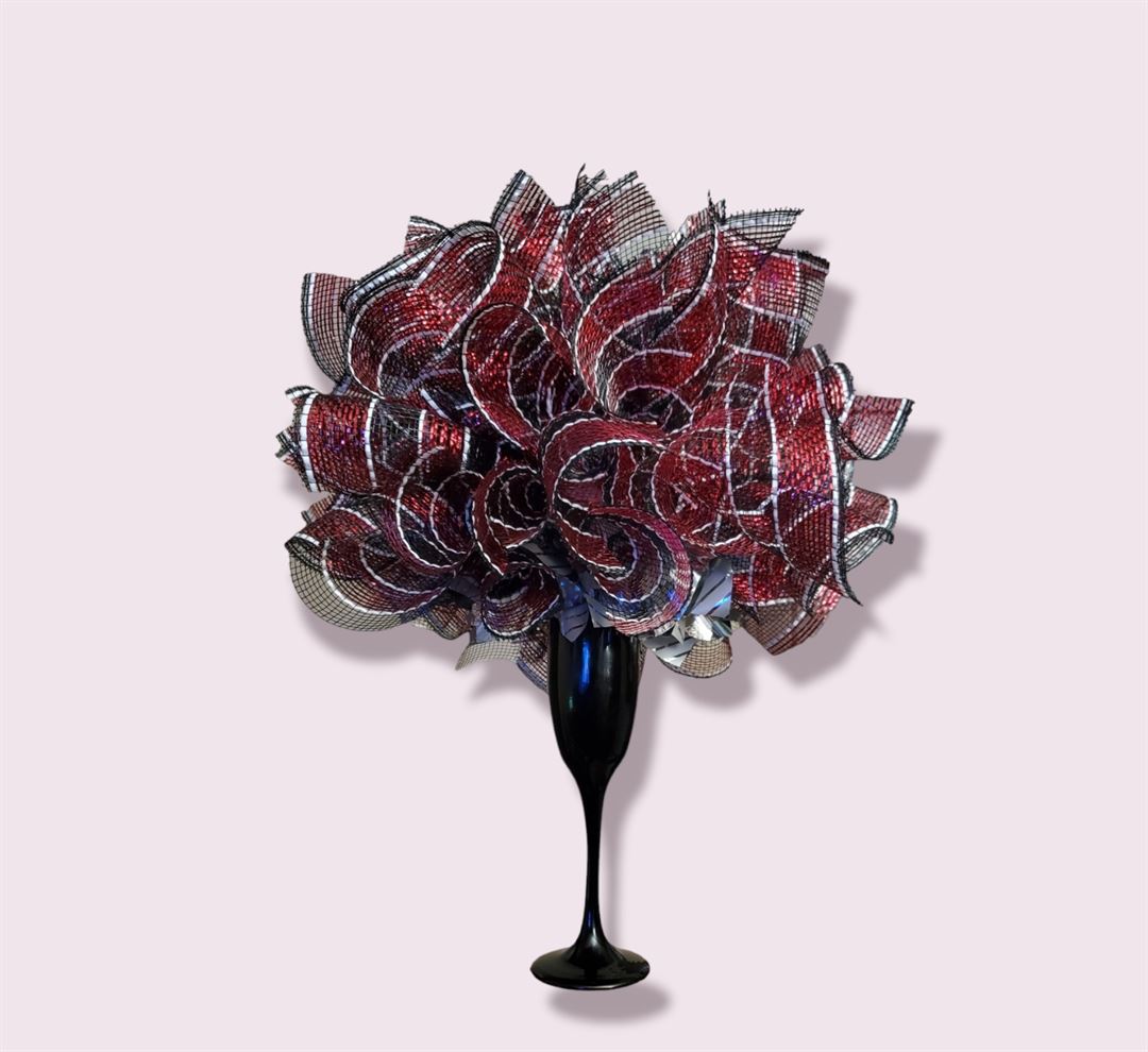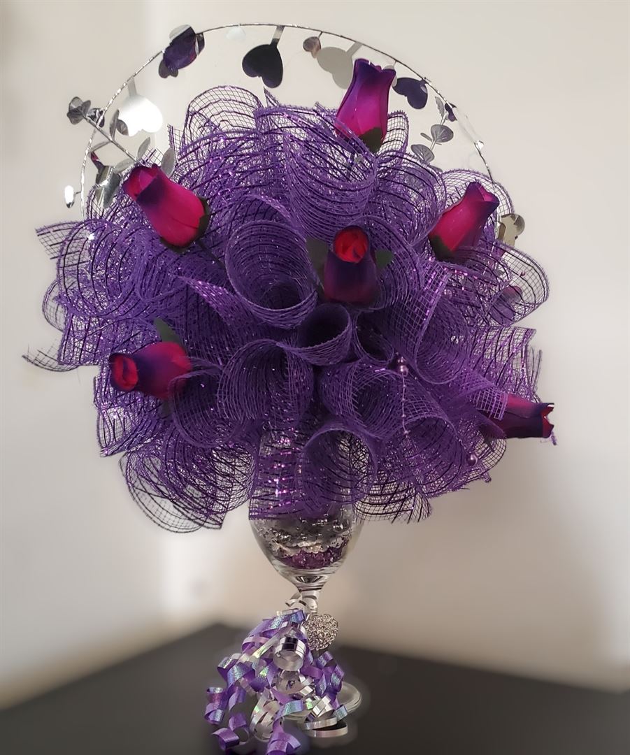 Floral inspired deco mesh arrangement in elegant stemware making for a timeless arrangement. Why buy fresh flowers and you can have a Timeless Bouquet!