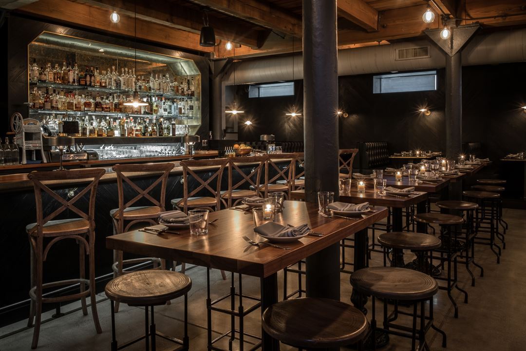 Located on the lower level, our private dining room seamlessly blends the personalities of the two restaurants to which it caters. The design of the space is reminiscent of a stylish yet cozy urban loft with an exposed brick wall and distressed wood beams throughout. Richly grained dark wood tables add warmth to the space, while the vintage leather couch and forest-themed backdrop behind it bring a sense of whimsy. The intimate room is perfect for both celebrations and business affairs with audio/visual capabilities.