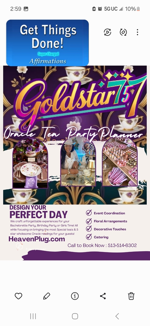 Book your next dream event with Goldstar747 at HeavenPlig.com! Together we curate an event that will have everyone celebrating for years to come! Heaven Plug has 5 star oracles, & artists & plans exquisite tea parties and paint and sips