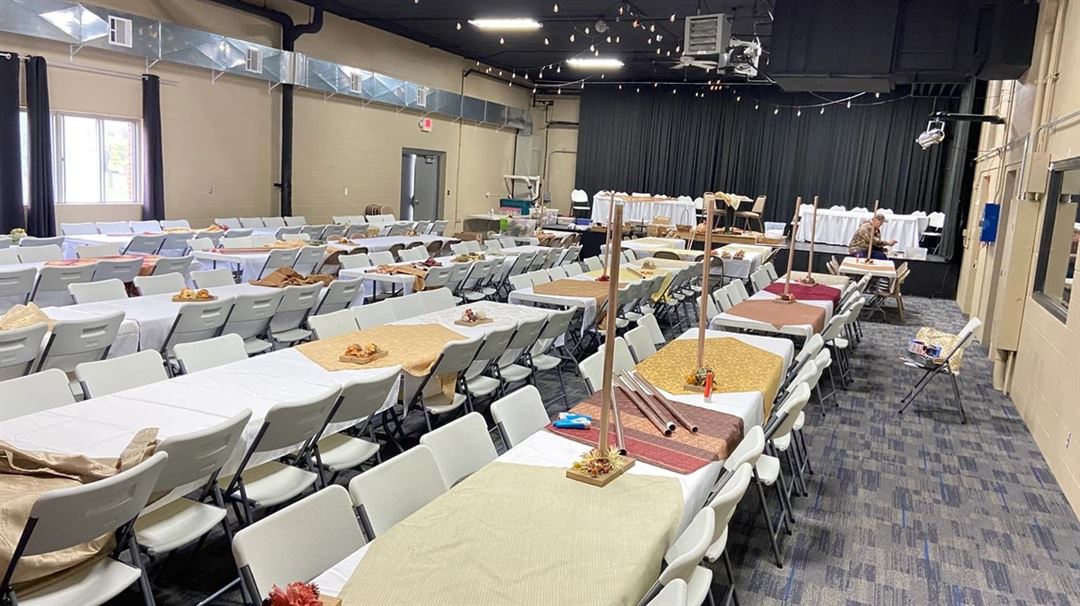 Featuring a large room with stage, and a small room for your food prep, banquet line, or staging. Three private restrooms. Large, commercial serving cart, refrigerator and more. Tables and chairs are included in rental price. Commercial kitchen available