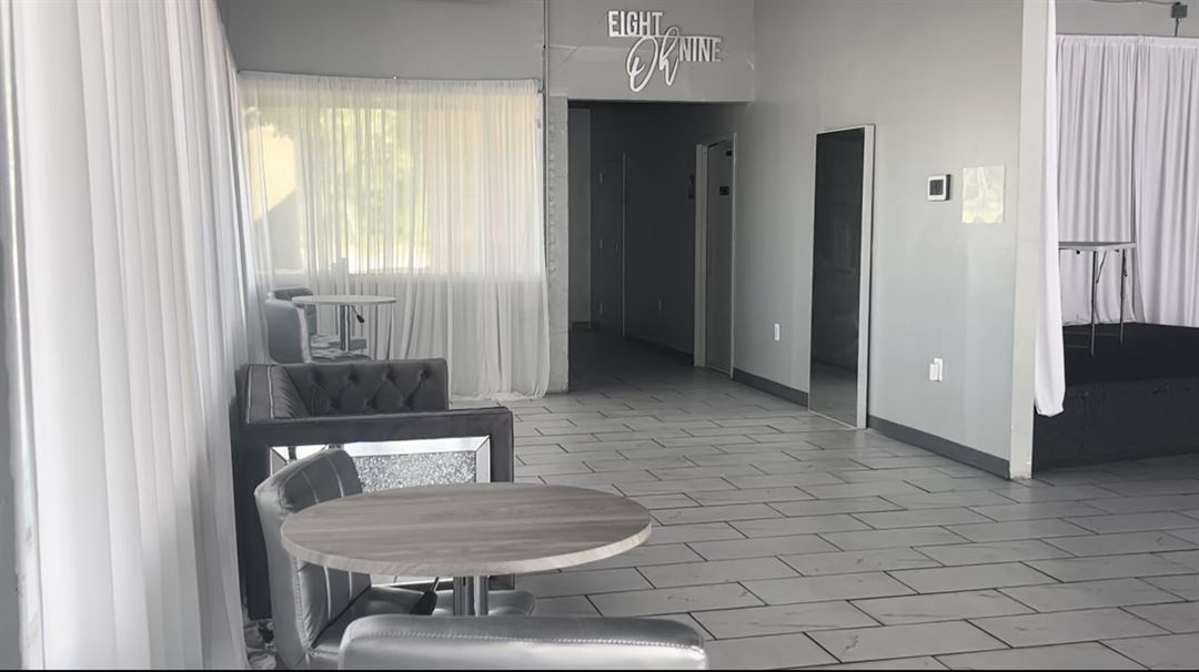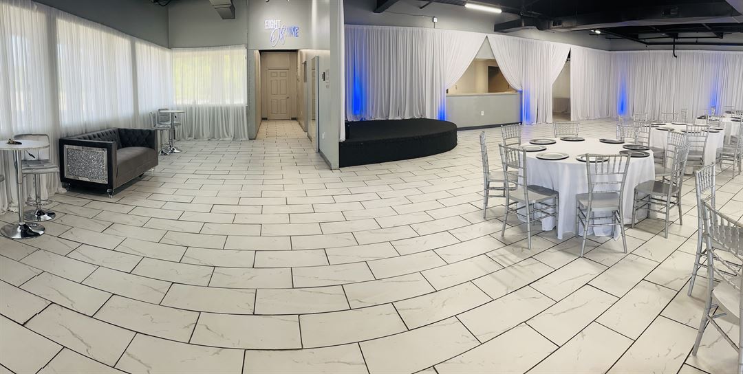 4900 soft Event Venue. Amenities include a full prep kitchen, full room white draping, uplights, table linen, charger plates , Wi-Fi and Bluetooth speaker