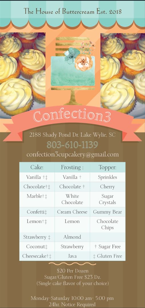 We're an in-home cupcakery that strictly follows SC Cottage Laws. We specialize in cupcakes and 6" celebration cakes for all occasions.