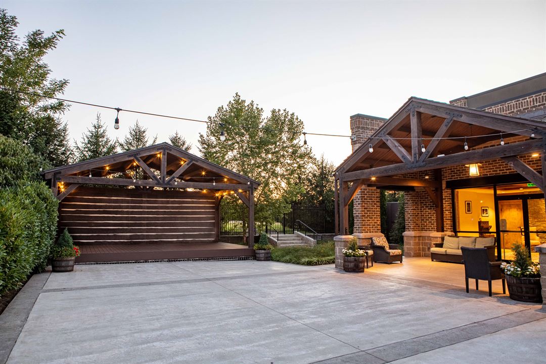 We can accommodate up to 150 people for standing receptions and 100 for seated events (including a dance area) on our 25 x 95 stone patio for your event. The rental also includes use of our large 24 x 16 raised outdoor stage, providing a perfect place for a ceremony and/or live music.