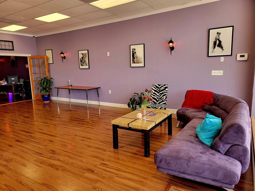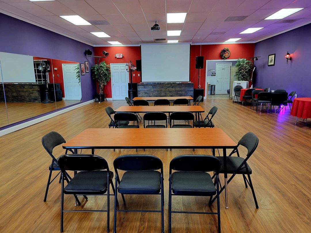 Wall mural, mirrors, DJ booth, reception room, kitchenette, 2 bathrooms, beautiful hardwood floors. Seating for 80-100.