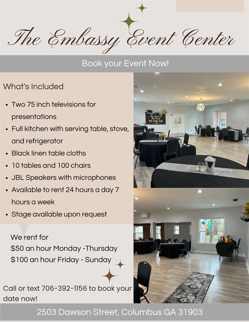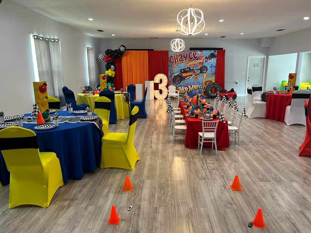 Welcome to the most beautiful event center to host your event! From a full kitchen to gated parking, our building is sure to provide everything that you need for a beautiful event! Our building can hold over 100 people banquet style. Give us a call to discuss your event today!