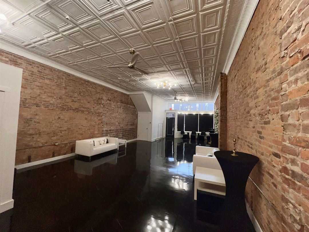 This intimate, yet chic, micro space allows you and your guests to have a private location to enjoy just about any event. With exposed brick walls, high ceilings, fireplace, and decor within the open floor plan, both you and your guests will enjoy the modern loft feel. The space is perfect for small weddings, rehearsal dinners, wedding receptions, birthday parties, baby showers, bridal showers, or any quaint upscale private event.