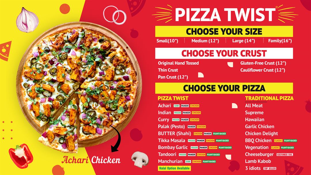 Special Features: Tradional pizza, Indian pizza, Italian pizza, Halal pizza, Wings, Pasta, Mac and cheese and Salads.