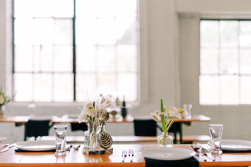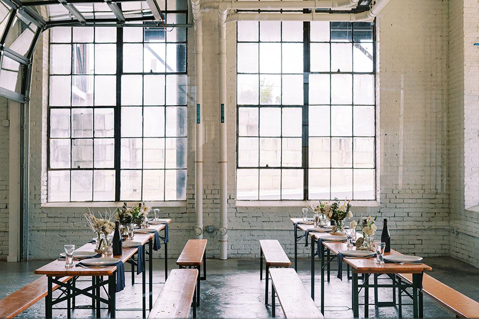 A bright and airy event space in the corner of our tap room. Filled with windows, creating an inviting space that can be used by you and your guests for birthday parties, wedding rehearsal dinners, corporate functions, family get-togethers, and more. A wonderfully repurposed space with a mix of new and old, filled with history while nestled in the century old former Gibson Textile Mill.