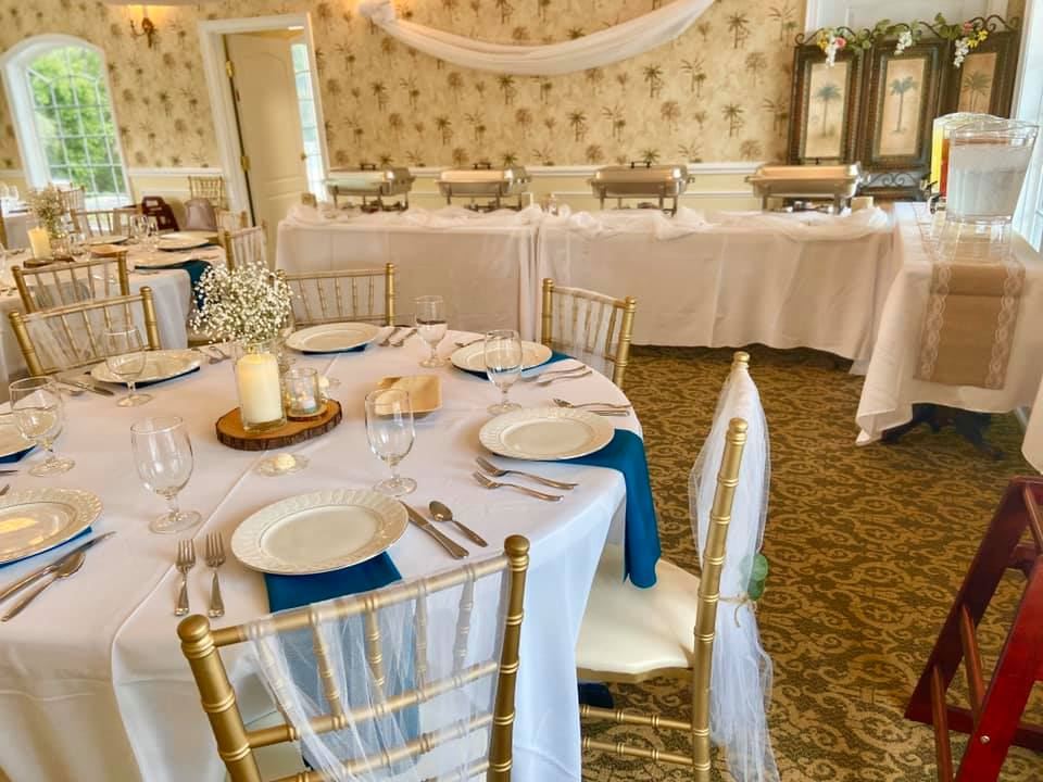 We have a beautiful banquet hall that accommodates up to 50 guests comfortably. We can add seating on our covered porch for additional guests. We also have 2 large lawn areas for outdoor events as well.
